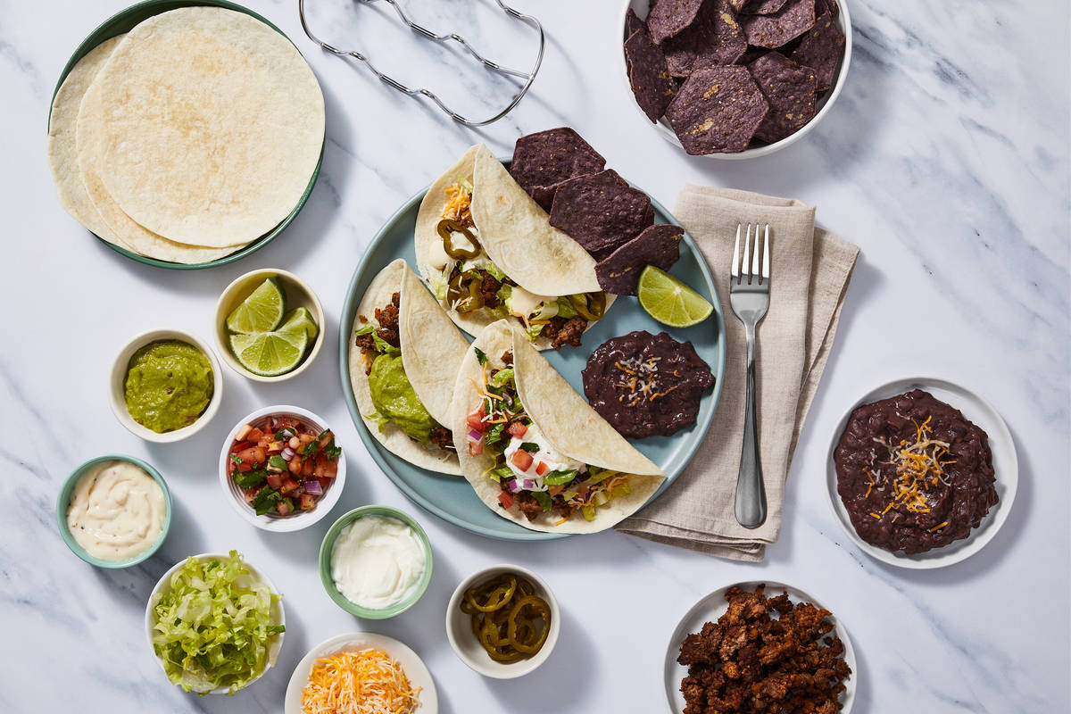 Serve shredded lettuce, pickled jalapeño (draining first), pico, refried beans, beef, queso, tortillas, guacamole, sour cream, and remaining Mexican cheese blend family style and let everyone build their own tacos. Serve tortilla chips and remaining lime wedges on the side. TIP: Add some extra crunch to your tacos by crushing up a few tortilla chips and sprinkling on top!
