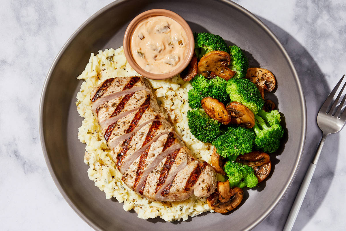 The height of comfort food starts with a bed of Yukon Golds mashed with sour cream and chives that gets topped with a juicy grilled pork chop and our crave-worthy million dollar–style sauce made with smoked cheddar, bacon, and scallions. On the side you’ll find a medley of roasted mushrooms and broccoli tossed in a flavorful garlic oil. **Ingredients:** Pork Chop, Yukon Gold Potatoes (Yukon Gold Potatoes, Sodium Metabisulfite (Added To Maintain Color)), Broccoli, Mushrooms, Heavy Cream (Heavy Cream, Milk, Gellan Gum, Sunflower Lecithin), Green Onions, Neufchatel Cheese (Pasteurized Milk And Cream, Skim Milk, Cheese Culture, Salt, Guar Gum, Carob Bean Gum, Xanthan Gum), Olive Pomace Oil (Refined Olive Pomace Oil, Extra Virgin Olive Oil), Shredded Smoked Cheddar Cheese ((Cultured Pasteurized Milk, Salt, Enzymes, Color Added), Powdered Cellulose (Anti-Caking Agent)), Light Sour Cream (Cultured Cream, Skim Milk), Whole Milk (Pasteurized Milk, Vitamin D3), Water, Nitrite/Nitrate-Free Uncured Bacon (Pork, Water, Salt, Celery Powder, Cherry Baste Aid), Garlic, Unsalted Butter (Pasteurized Cream, Natural Flavorings), Vinegar, Sea Salt, Red Wine Vinegar (Diluted With Water To 5% Acidity), Apple Cider Vinegar (Diluted With Water To 5% Acidity), Dried Chives, Toasted Garlic Powder, Granulated Garlic, Black Pepper, Granulated Onion, Dried Parsley, Thyme The nutrition facts are based off of the recommended serving size. Serving Size = 1 Tray (380g)