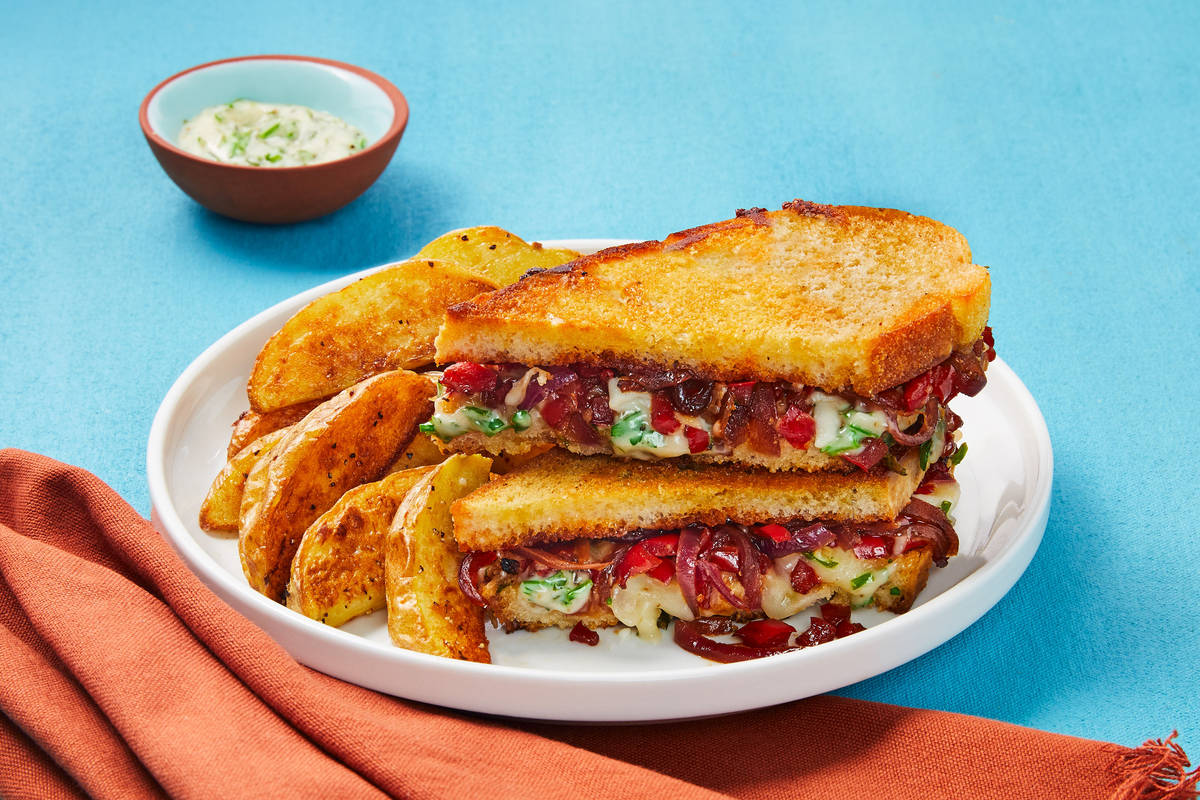No disrespect to the classic cheddar + white bread combo, but this isn’t your ordinary grilled cheese. Here, bell pepper and balsamic-infused red onion are cooked until caramelized and jammy to bring out their natural sweetness. The mixture gets sandwiched between slices of sourdough bread with mozzarella cheese and a creamy herb aioli, then toasted up in a hot pan until perfectly golden and melty. On the side, there’s tender roasted potato wedges, plus more of that addictive aioli for dipping—you won’t be able to get enough of it.