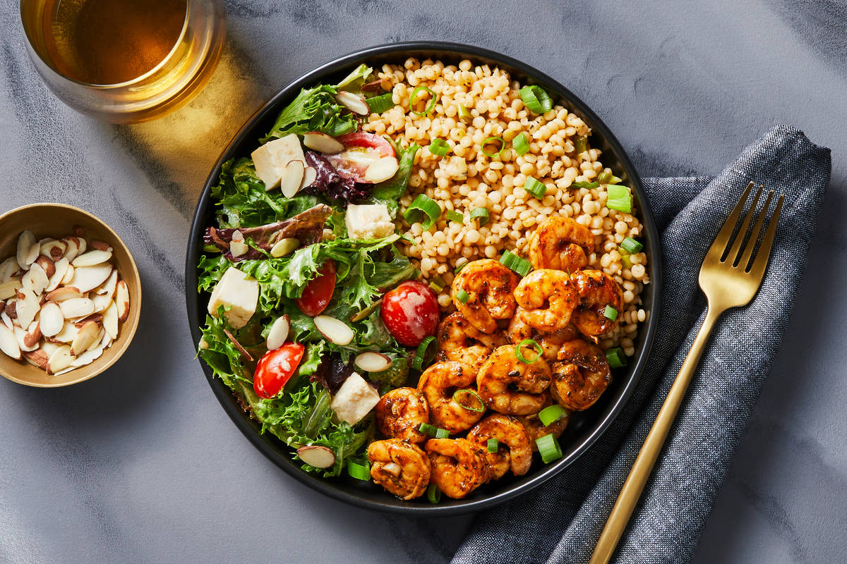 Looking for a tasty meal that will fill you up without weighing you down? Seafood is your friend! This dish features succulent shrimp marinated in garlic and two of our favorite spice blends. They're sautéed in butter, piled atop a scallion-lemon couscous, and served with a creamy balsamic-dressed green salad with fresh mozzarella, grape tomatoes, and a sprinkle of sliced almonds.