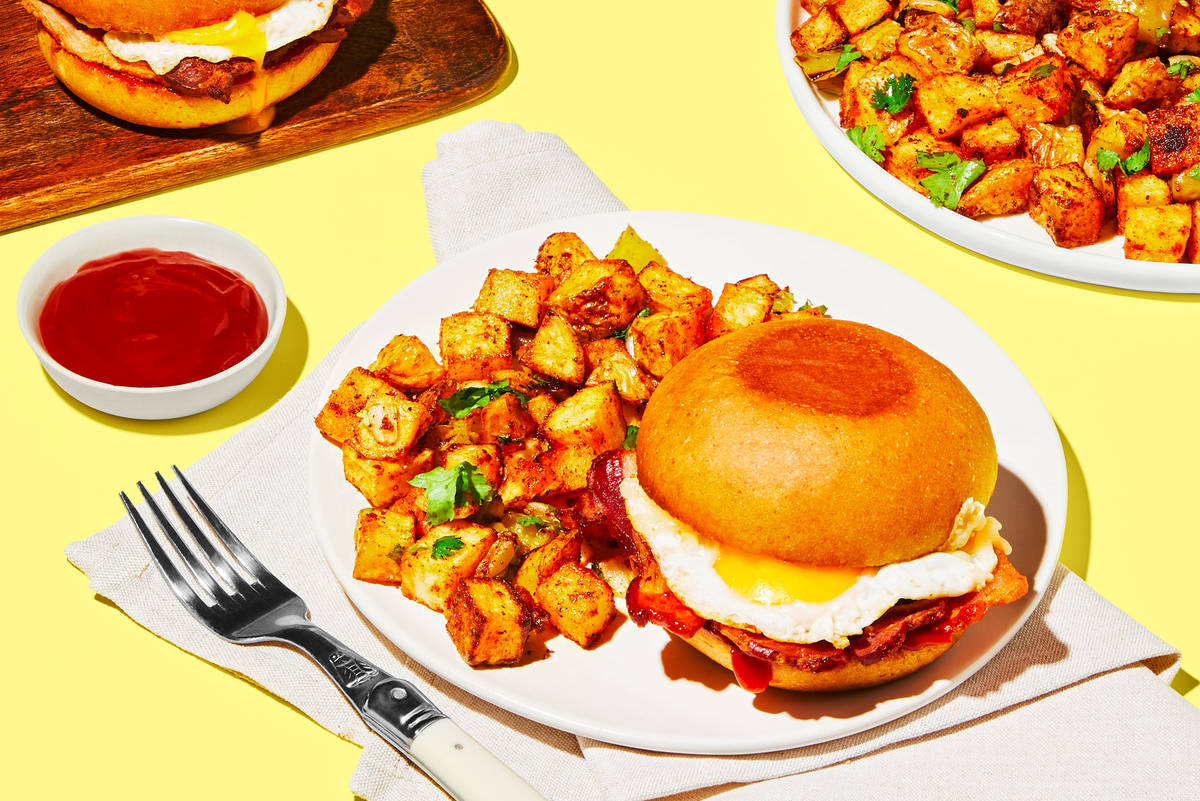 Breakfast sandwiches are easy enough to come by, but a full-blown brunch bonanza such as this? That’s another story! Luckily, we’re covering the ingredients and the recipe—all you need to do is whip it up and chow down. Let us formally introduce you to our ultimate BEC. There’s bacon-fat-fried eggs, crispy bacon, and toasty buns covered in melty cheddar. For even more heft, we’ve added a potato, pepper, and onion hash tossed with chopped cilantro on the side. So, pour yourself a cup of coffee (or a mimosa), take a bite, then take on your day.