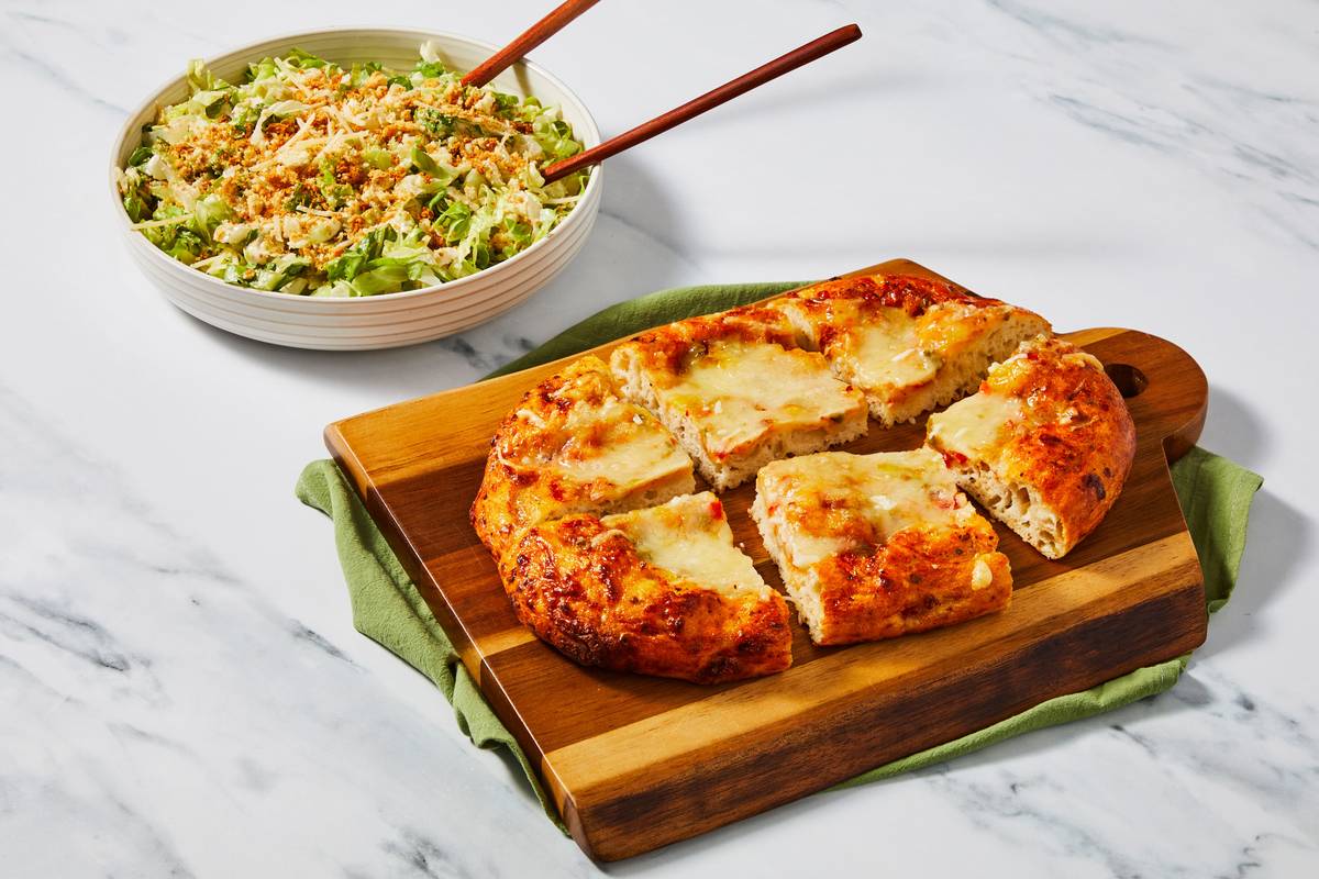 Meet the perfect ready-to-serve pairing for an easy, crowd-pleasing dinner. A classic cheese pizza—complete with a golden-baked crust, tangy marinara, and plenty of melty mozz—teams up with a refreshing Caesar salad loaded with crisp romaine lettuce, punchy Parmesan, and crunchy garlic croutons. Toss your salad with creamy Caesar dressing while the pizza bakes, and you’ve got a no-stress meal everyone will love.