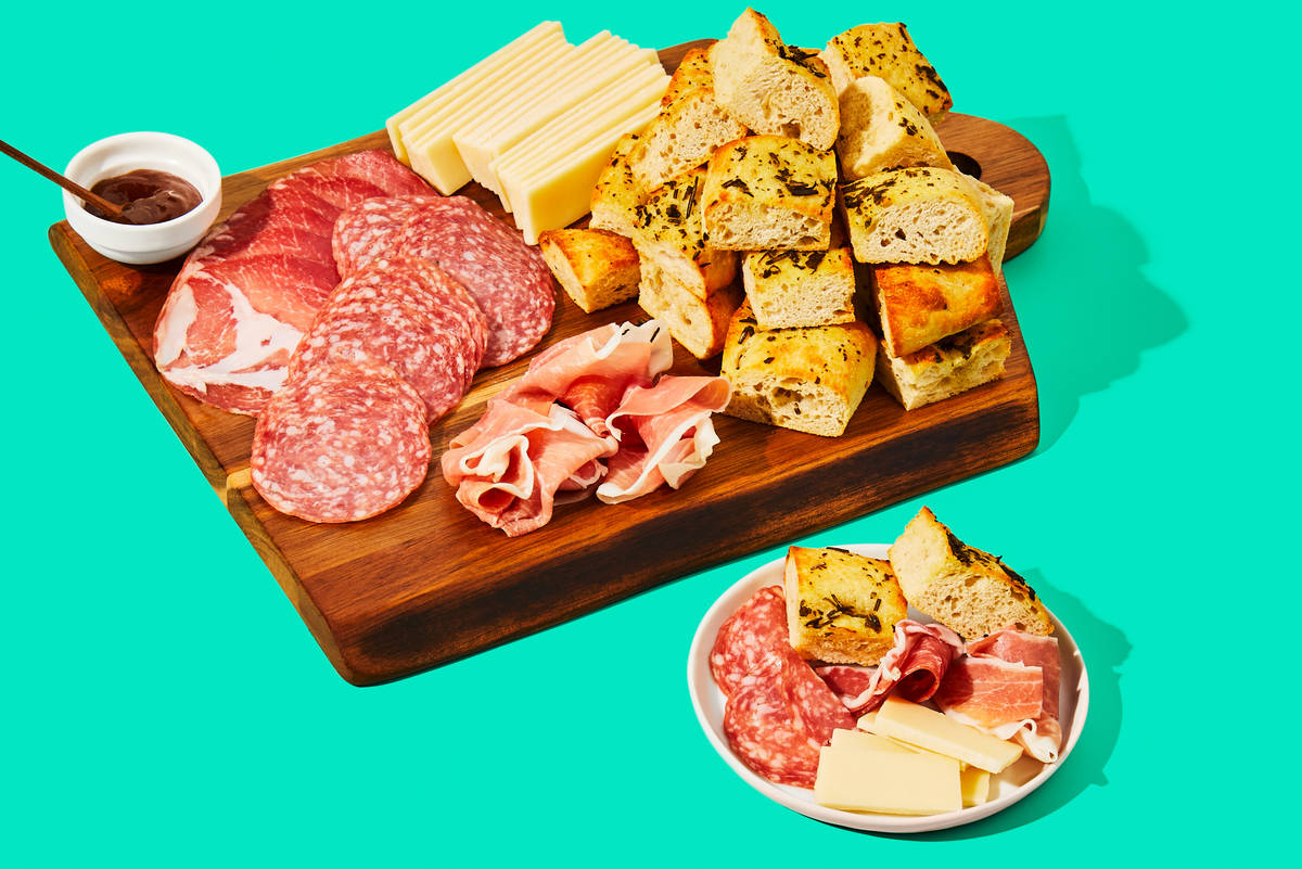Serve cheese and charcuterie with focaccia and fig jam.