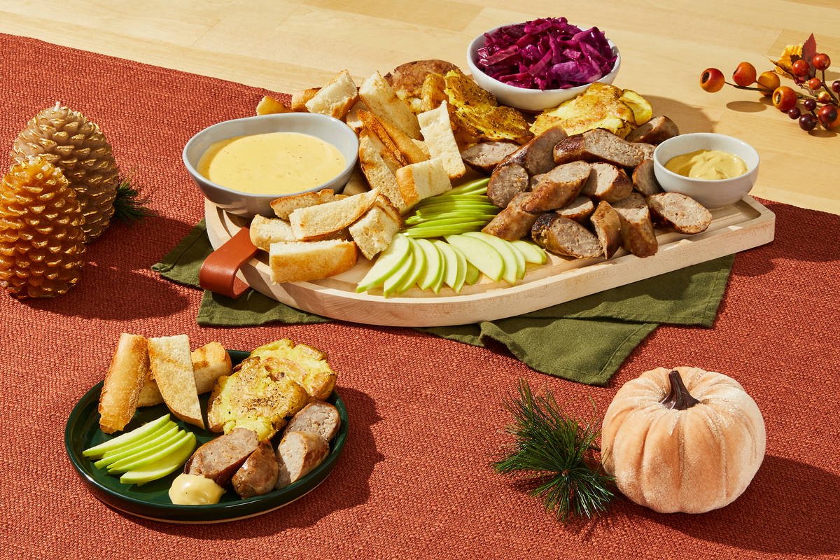 No need to travel all the way to Germany to enjoy a hearty assortment of meat and cheese! Chock-full of delicious fall flavors, you’ve got brats, Granny Smith apple slices, pickled red cabbage, toasted baguette slices, and crispy smashed potatoes, plus Dijon mustard and cheese fondue for dipping. Perfect for fall hosting or an afternoon curled up on the couch.