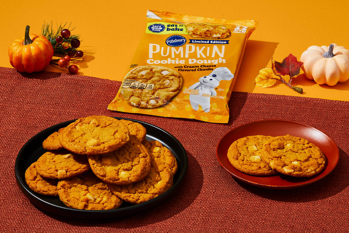 The search for your dream fall treat is finally over. Once this cookie dough is baked, these pumpkin cookies, studded with cream cheese-flavored chips, are the ideal mix of crispy and chewy. The best part? No mixing, no slicing, no mess—all you have to do is break, bake, and dig in. *Nutrition values are representative of 1 cookie.*