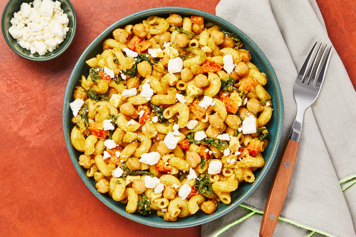 You’ve had middle-eastern flavors in salads, grain bowls, and gyros—but have you tried ‘em in a pasta? If not, consider this your lucky dinner! Chickpeas, spinach, and onion are cooked with garlic and our signature Shawarma Spice Blend, then swirled in a creamy white sauce. Next, you’ll add tender cavatappi, fresh tomatoes, and feta cheese for brimming bowls full of bright flavors. It’s pasta night, perfected!