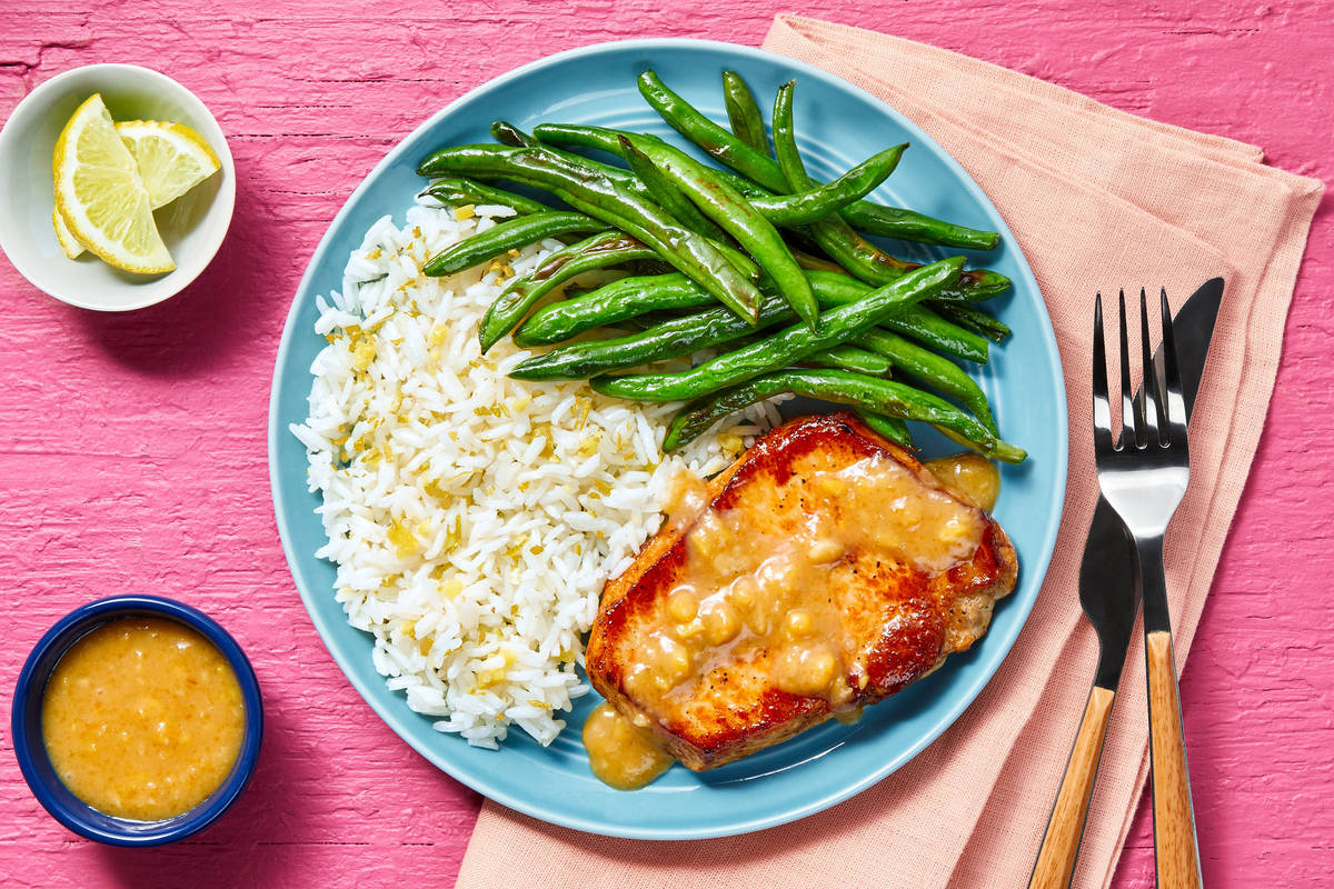 Looking for a way to add tons of extra flavor to your meal with almost NO effort? We’ve got two words for you: pan sauce. This one comes together in less than 5 minutes with aromatic fresh ginger and garlic, umami-packed miso sauce concentrate, and sweet peach jam. It’s drizzled all over seared pork chops, then served with fluffy rice and tender green beans. If you find yourself licking the plate clean, we won’t judge.