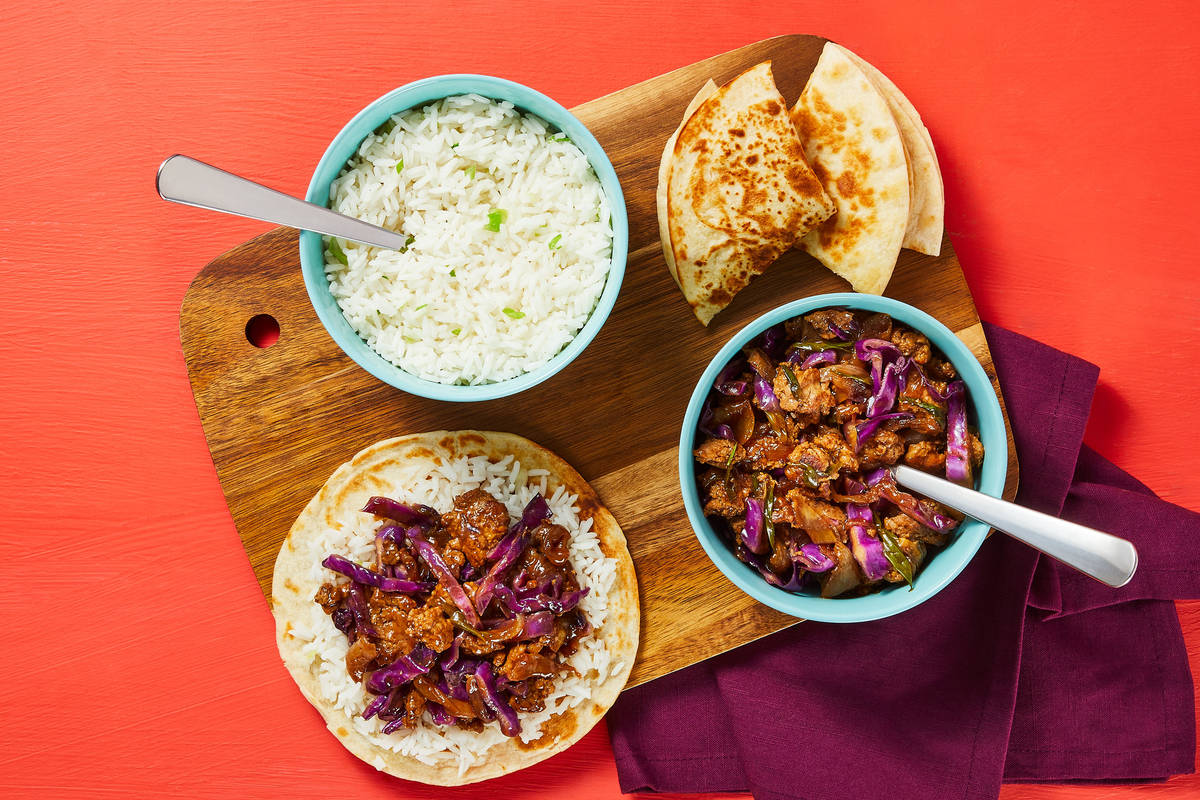• Fluff rice with a fork; stir in 1 TBSP butter (2 TBSP for 4 servings) until melted. • Transfer rice to a serving bowl. Fold tortillas in half, then into quarters. Place rice and tortillas on platter with moo shu pork. • Serve family style, combining rice, moo shu pork, and tortillas however you like!