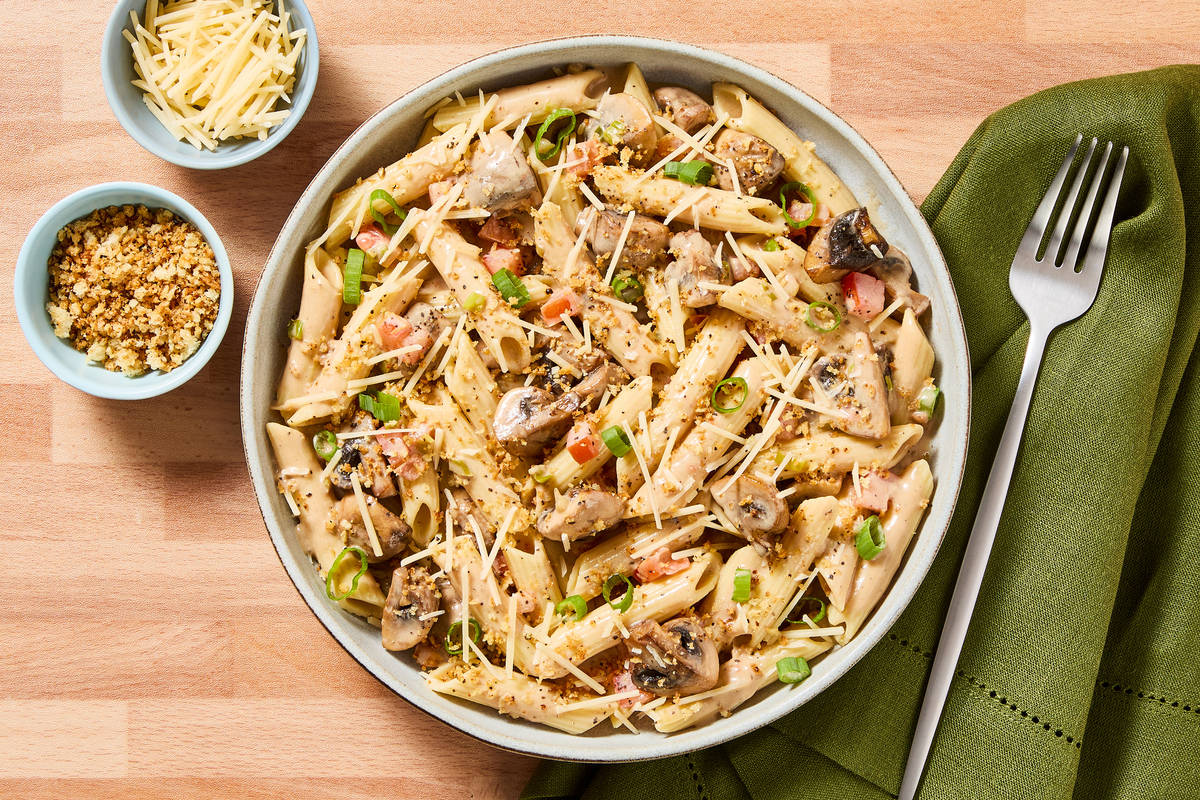 Treat yourself to truffles with tonight’s ’shroom-packed pasta. You’ll start with penne, which you’ll cook until tender, then toss in a silky, savory sauce of sautéed button mushrooms, garlic powder, mushroom stock, cream cheese, and Parmesan. A swirl of butter and dusting of truffle seasoning take the rich and umami flavors to the next level. Garnish everything with crunchy, garlicky panko, then pour yourself a glass of wine and toast to a restaurant-worthy dinner.