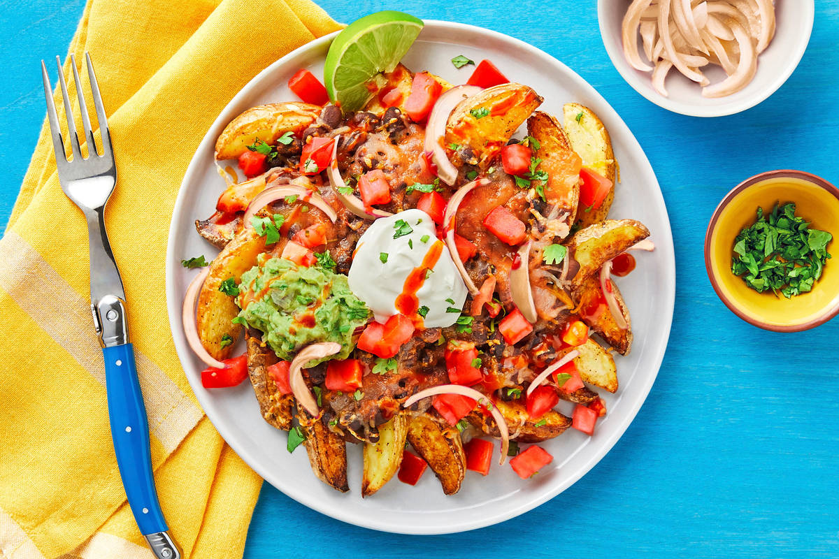 If you thought nachos couldn’t get any more customizable, think again. This week, our chefs have swapped out the typical tortilla chips for… drumroll please… CRISPY POTATO WEDGES (yes, you read that right!). In the last few minutes of roasting, the oven fries are topped with saucy, spiced black beans and plenty of melty cheese, then loaded up with toppings: guacamole, lime crema, pickled onion, hot sauce, and chopped tomato and cilantro. We can’t decide if we have more fun assembling this dish, or eating it!
