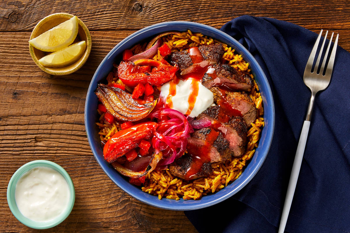 One of our all-time favorite NYC eats? A bowl packed with fluffy rice, richly-spiced meat, tender veggies, and creamy sauce. For this version, we’re sending sirloin steak that’s pre-marinated in turmeric, paprika, garlic powder, and other seasonings so you get extra-flavorful results in no time. For even more depth, we add aromatic shawarma spices, then sear the meat until tender. It’s served over rice with roasted onion, tomato, and bell pepper, plus garlicky white sauce AND hot sauce for creamy, spicy goodness in every bite.