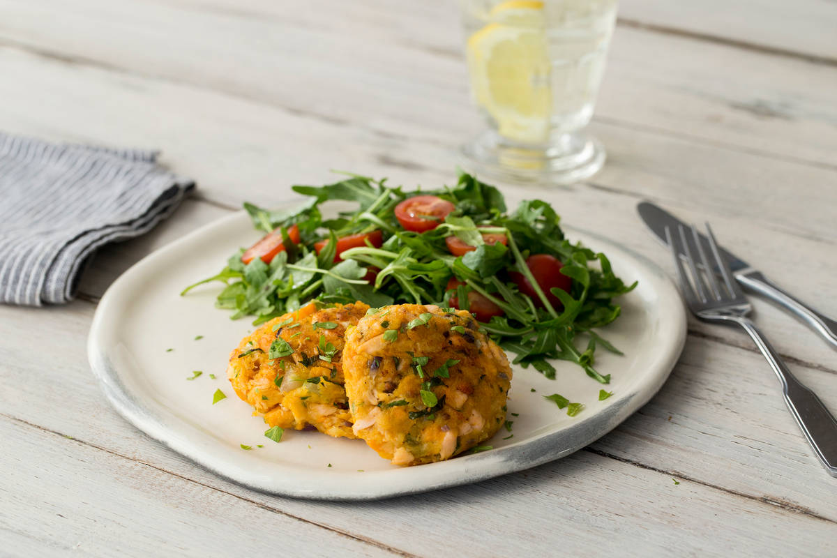 Inspired by Maryland crab cakes, this recipe calls on everyone's favorite Old Bay seasoning for serious flavor. Creamy sweet potato binds together flaky salmon, sautéed aromatics, and light panko breadcrumbs for tender pan-seared salmon cakes.