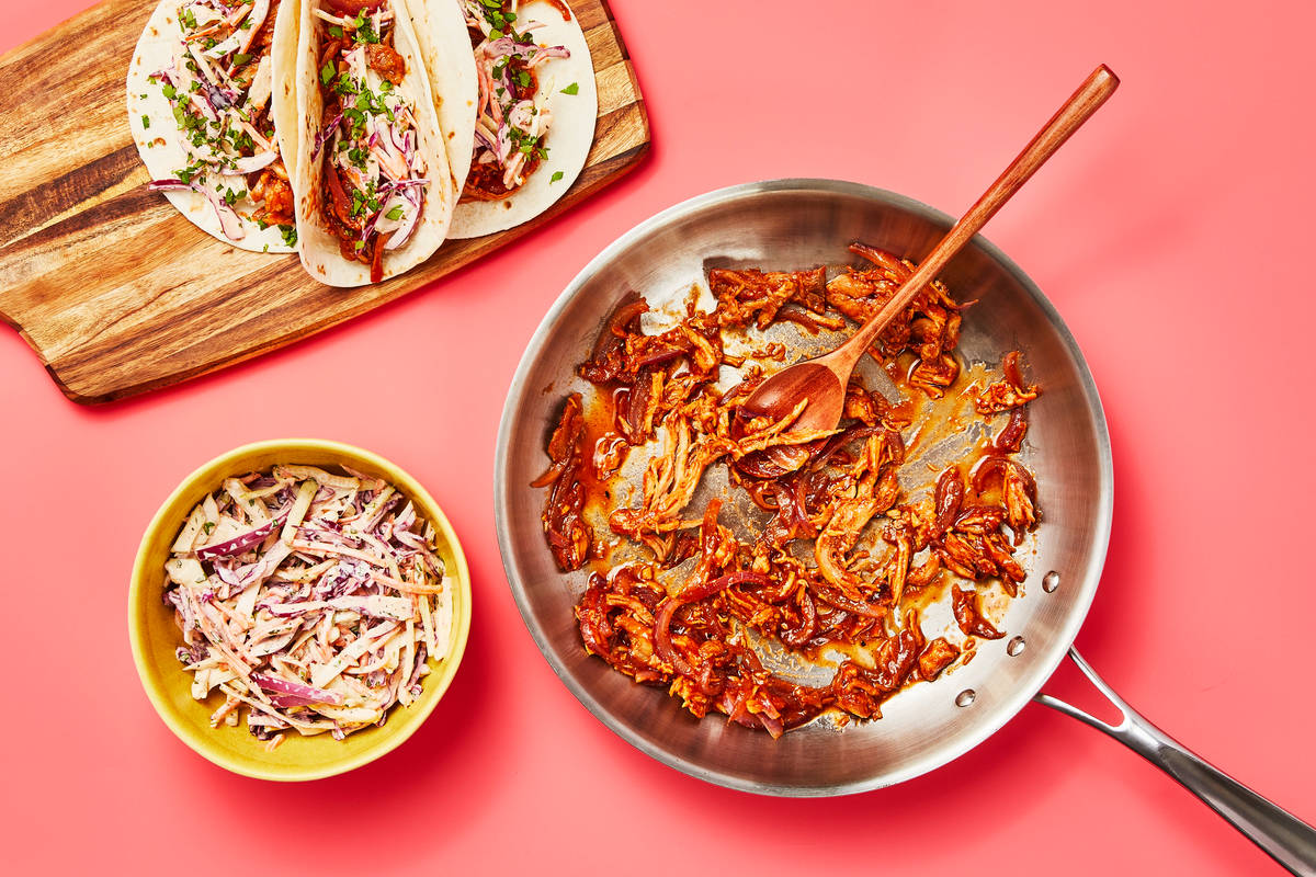 Dreaming up ways to spice up taco night? Look no further: This mashup version delivers all the flavors of a cookout, no grill required. Pulled barbecue chicken is tossed with sautéed onion and lime juice to form the saucy filling. It’s stuffed into warm tortillas with a creamy, spicy slaw for crunchy contrast. Plus, it’s all ready in just 15 minutes—taco ’bout a dinner winner.