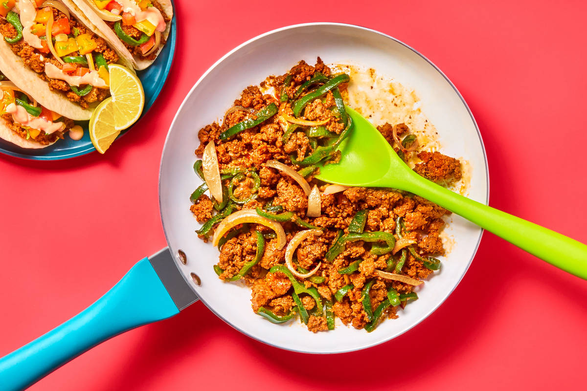 • Heat a drizzle of oil in same pan over medium-high heat. Add beef*, Blackening Spice, and a big pinch of salt. Cook, breaking up meat into pieces, until browned and cooked through, 4-6 minutes. • Stir in stock concentrate and 2 TBSP water (3 TBSP for 4 servings); bring to a simmer. • Return veggies to pan, stirring, until thoroughly combined. (TIP: Add a splash or two of water, if necessary, until mixture is saucy.) Taste and season with salt and pepper.