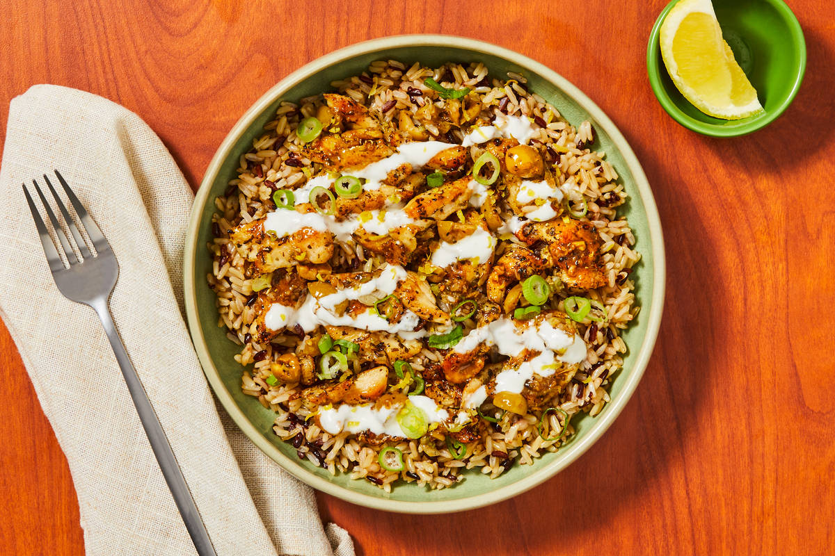 For this Moroccan-style meal, you'll make a savory, complex sauce from olives, garlic, and scallions plus lemon and cumin—a perfect pairing for herbes de Provence seared chicken cutlets. Serve the saucy chicken over our grain blend, drizzle with sour cream, and sprinkle with scallion greens for bright crunch. Best of all, the meal comes together in a quick 30 minutes!