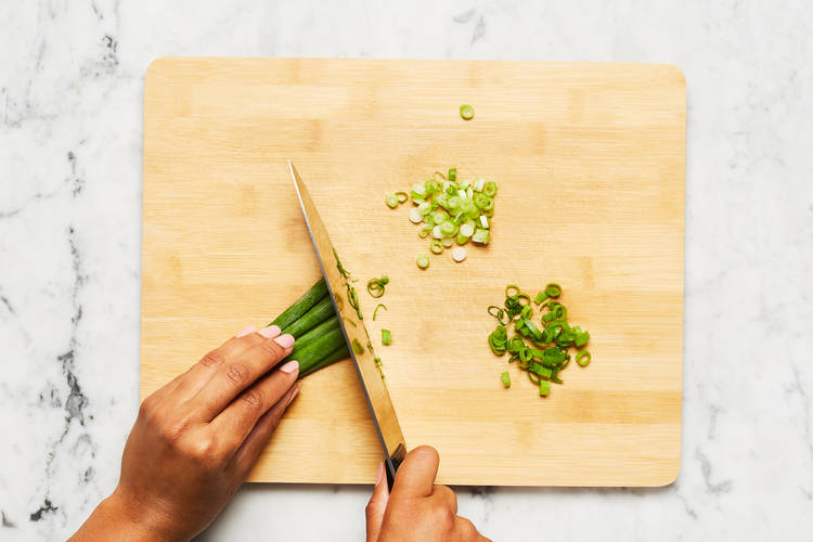 Trim and thinly slice scallions, separating whites from greens. Thinly slice half the jalapeño into rounds; mince remaining. (TIP: Remove ribs and seeds for less heat.) Dice tomato.