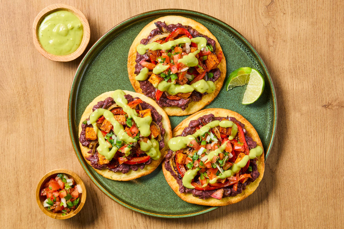 • Divide tostadas between plates; spread each with refried beans. Top with roasted veggies, salsa, and creamy guacamole. Serve with remaining lime wedges on the side.