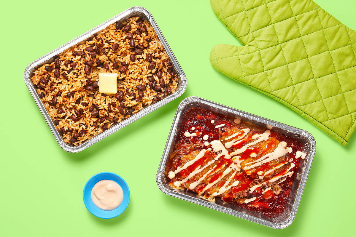 There’s almost nothing better than cheesy, veggie and protein-filled enchiladas for dinner. Almost. For this ready-in-no-time-meal, our chefs ditched flour tortillas and baked a delicious chicken enchilada filling in our handy oven-ready aluminum trays instead. Can you say cleanup in a breeze? To bulk out the meal, there’s rice and beans plus a drizzle of hot sauce and homemade crema.