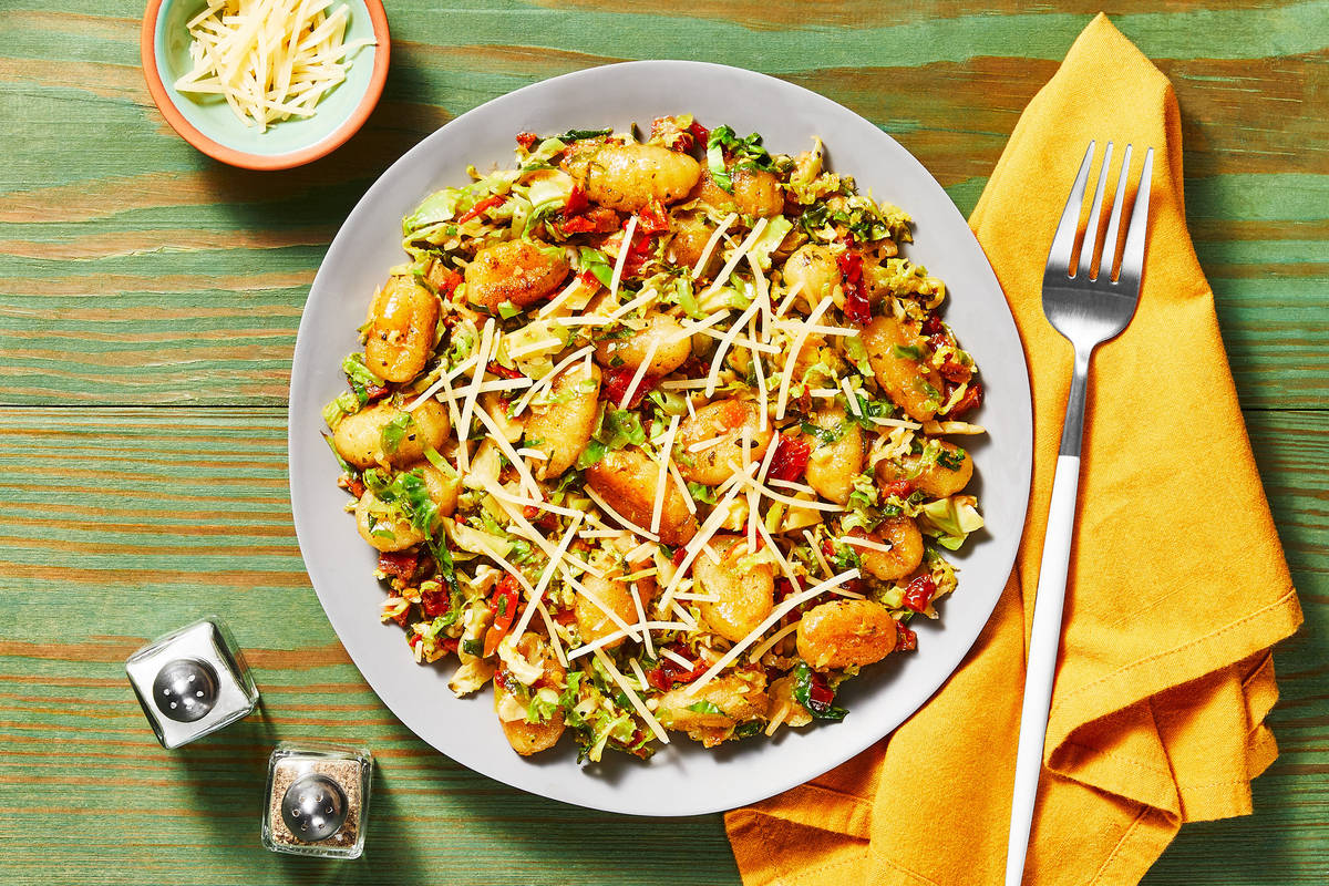 Pan-frying just about anything builds up extra flavor—and these gnocchi are proof. You’ll start with pillowy potato gnocchi, which you’ll cook in butter until brown and crisp. They get tossed with sun-dried tomatoes and Brussels sprouts. A swirl of garlic herb butter and dusting of Parmesan take the rich and umami flavors to the next level. Pour yourself a glass of wine, you’re ready to toast to a restaurant-worthy dinner in just 20 minutes.