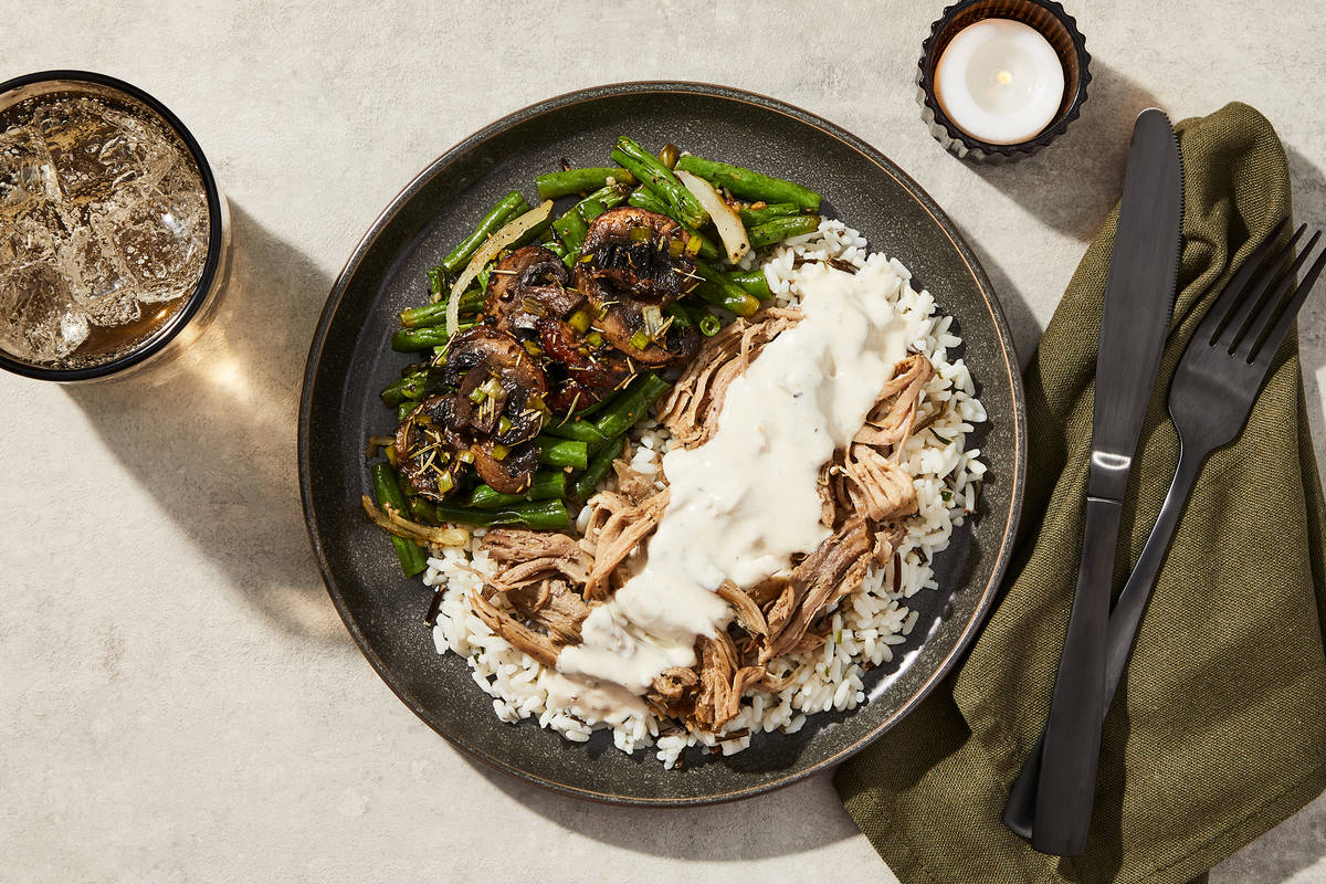 Tender slow-roasted pork is shredded and topped with a luscious garlic sauce made with heavy cream and Parmesan served atop a bed of wild rice cooked in rich chicken stock. It’s accompanied by roasted crimini mushrooms and leeks, plus a side of roasted green beans. **Ingredients:** Sous Vide Pork Shoulder (Pork, Pork Stock, Vinegar, Onion, Garlic, Salt, Yeast Extract, Sea Salt, Rosemary Extract), Green Beans, Water, Long Grain And Wild Rice Blend (Long Grain Parboiled Rice (Enriched With Iron (Ferric Orthophosphate), Niacin, Thiamine Mononitrate, Folic Acid), Wild Rice), Mushrooms, Reduced Fat Milk (Pasteurized Reduced Fat Milk, Vitamin A Palmitate, Vitamin D3), Cream Cheese (Pasteurized Milk And Cream, Salt, Cheese Culture, Stabilizers (Xanthan Gum, Carob Bean Gum, Guar Gum)), Grated Parmesan Cheese (Imported Parmesan Cheese (Pasteurized Cow'S Milk, Cheese Culture, Salt, Enzymes), Water, Milk Protein, Palm Oil Blend, Disodium Phosphate, Citric Acid, Xanthan Gum, Powdered Cellulose (Anti-Caking Agent), Calcium Propionate (Preservative)), Onions, Heavy Cream (Heavy Cream, Milk, Gellan Gum, Sunflower Lecithin), Olive Pomace Oil (Refined Olive Pomace Oil, Extra Virgin Olive Oil), Leeks, Vinegar, Brown Chicken Stock (Chicken Stock, Mirepoix Stock (Made Of Carrot, Celery And Onion Stocks), Salt, Gelatin, White Wine), Toasted Garlic, Green Onions, Toasted Garlic Powder, Reduced Brown Stock (Veal Stock (Veal Bones, Water), Beef Stock, Mirepoix Stock (Made Of Carrot, Celery, And Onion Stocks), Tomato Paste, Salt, Gelatin, Red Wine Concentrate (Sulfites), Onion Juice Concentrate, Carrot Juice Concentrate, Celery Juice Concentrate, Yeast Extract, Natural Flavors), Dried Chives, Sea Salt, Toasted Onion Powder, Granulated Onion, Granulated Garlic, Black Pepper, Thyme, Rosemary The nutrition facts are based off of the recommended serving size. Serving Size = 1 Tray (352g)