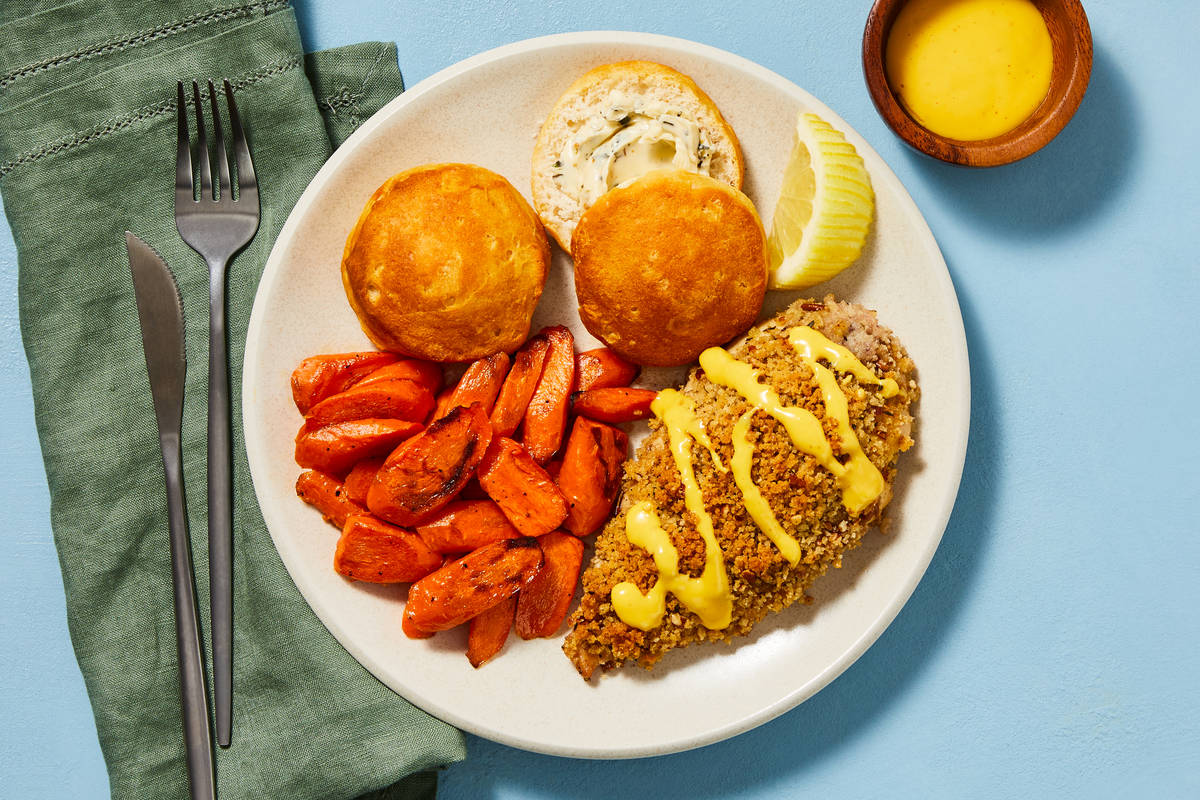 There’s nothing quite like crunchy-topped chicken. But these chicken cutlets take it to the next level: They’re coated first in tangy honey Dijon dressing, then crusted in a pecan, panko, and thyme mixture. As the chicken cooks, the topping crisps up in the oven without losing the juicy interior. To add even more textures and flavors to this meal, there’s lemony roasted carrots, flaky buttermilk biscuits, and a rich garlic thyme compound butter on the side. It’s a meal fit for royalty.