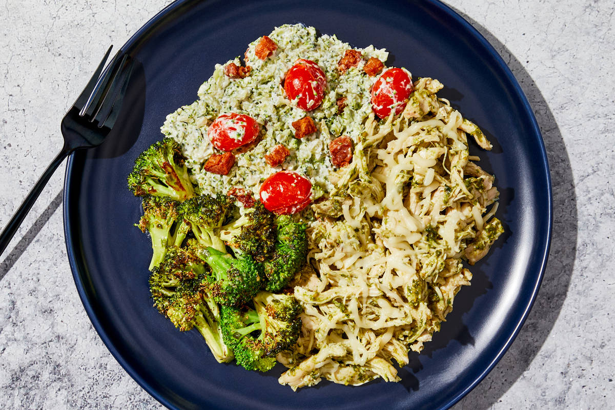 Savor this comforting dish, featuring broccoli two ways. We begin with a helping of ultra-creamy herb-Parmesan broccoli “rice.” It’s served alongside juicy shredded chicken tossed with an earthy, nut-free spinach and basil pesto, which is then topped with mozzarella, tangy roasted balsamic tomatoes, and salty chopped bacon. It’s paired with broccoli florets dolloped with melty garlic herb butter. Ingredients: Boneless Chicken Breast With Rib Meat, Broccoli, Riced Broccoli, Grape Tomatoes, Olive Pomace Oil (Refined Olive Pomace Oil, Extra Virgin Olive Oil), Shredded Low Moisture Mozzarella Cheese (Pasteurized Milk, Cheese Cultures, Salt, Enzymes, Anti-Caking Agents (Potato Starch, Powdered Cellulose) Natamycin (A Natural Mold Inhibitor)), Heavy Cream (Heavy Cream, Milk, Gellan Gum, Sunflower Lecithin), Cream Cheese (Pasteurized Milk And Cream, Salt, Cheese Culture, Stabilizers (Xanthan Gum, Carob Bean Gum, Guar Gum)), Grated Parmesan Cheese (Imported Parmesan Cheese (Pasteurized Cow'S Milk, Cheese Culture, Salt, Enzymes), Water, Milk Protein, Palm Oil Blend, Disodium Phosphate, Citric Acid, Xanthan Gum, Powdered Cellulose (Anti-Caking Agent), Calcium Propionate (Preservative)), Water, Unsalted Butter (Pasteurized Cream, Natural Flavorings), Nitrate/Nitrite-Free Uncured Bacon (Pork, Water, Salt, Celery Powder, Cherry Baste Aid), Onions, Vinegar, Balsamic Vinegar (Wine Vinegar, Concentrated Grape Must, Cooked Grape Must, Caramel Coloring, Sulfites), Basil, Lemon Juice, Granulated Garlic, Garlic, Sea Salt, Spinach, Black Pepper, Toasted Garlic Powder, Italian Seasoning (Garlic, Oregano, Basil, Black Pepper, Parsley, Rosemary, Marjoram, Thyme, Savory, Sage), Smoked Black Pepper (Pepper, Smoke Flavor), Granulated Onion, Dried Dill, Thyme, Rosemary, Dried Parsley, Dried Chives The nutrition facts are based off of the recommended serving size. Serving Size = 1 Tray (363g)
