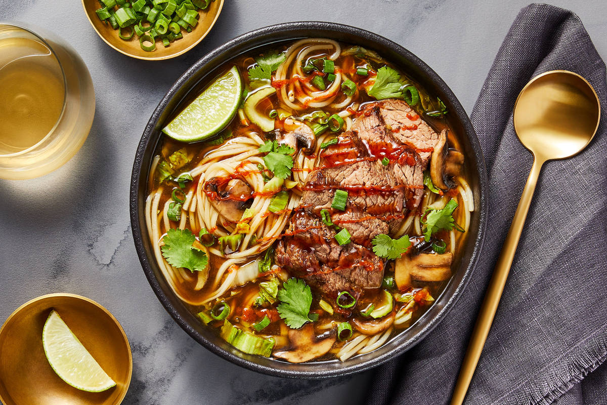 • Divide noodles and sliced steak between large soup bowls; pour broth over top. • Drizzle soup with hoisin and as much Sriracha as you like. Garnish with scallion greens and cilantro. Serve with remaining lime wedges on the side.