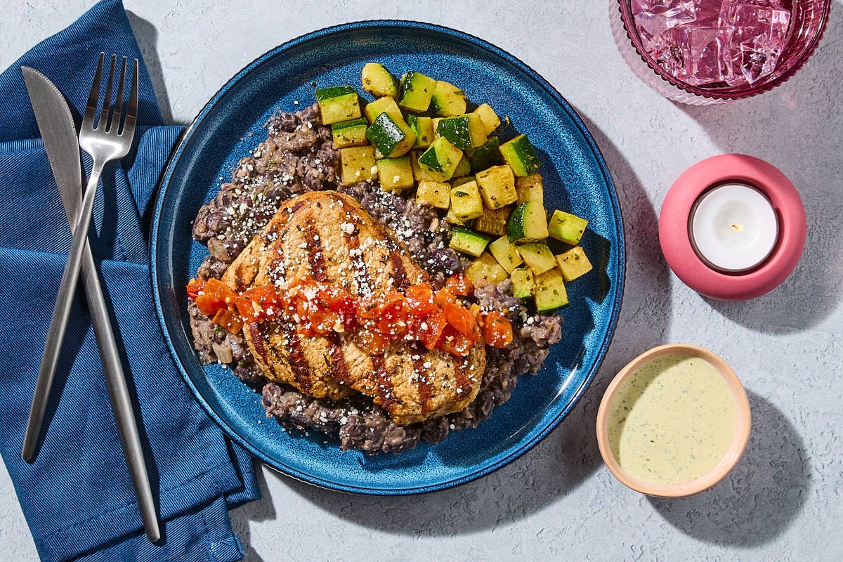 Spice up your dinner plans with this Southwestern-inspired dish! A tender, marinated pork chop sits atop creamy smashed black beans, crowned with a vibrant roasted pico de gallo and salty crumbled queso fresco. On the side, enjoy Mexican-spiced roasted zucchini and a dollop of zesty cilantro crema to tie it all together. **Ingredients:** Pork Chop, Zucchini, Black Beans (Prepared Black Beans, Water, Salt, And Calcium Chloride (Firming Agent)), Light Sour Cream (Cultured Cream, Skim Milk), Tomatoes, Water, Onions, Olive Pomace Oil (Refined Olive Pomace Oil, Extra Virgin Olive Oil), Lime Juice (Water, Lime Juice From Concentrate), Cilantro, Garlic, Queso Fresco (Pasteurized Whole Cow'S Milk, Salt, Enzymes, Culture, And Powdered Cellulose (To Prevent Caking)), Vinegar, Sea Salt, Cumin, Granulated Garlic, Apple Cider Vinegar (Diluted With Water To 5% Acidity), Black Pepper, Ancho Chile Powder, Chili Powder (Chili Pepper, Spices (Including Mustard), Salt, Garlic Powder), Coriander, Dried Oregano, Paprika (Paprika And Silicon Dioxide (Added To Make Free Flowing)), Smoked Paprika The nutrition facts are based off of the recommended serving size. Serving Size = 1 Tray (369g)