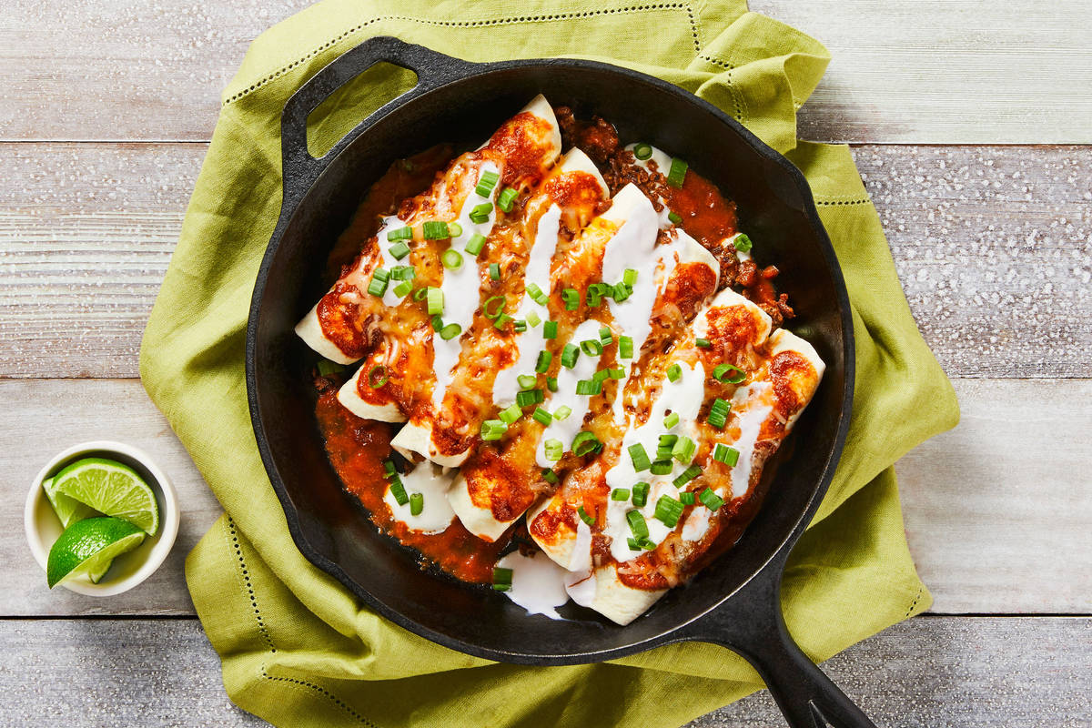 Saucy, smothered, hearty, and delicious: This meatless twist on a classic enchilada bake has everything you could possibly want. You’ll make it by wrapping flour tortillas around a filling of spiced ground plant-based protein, then coating the bundles with a healthy glug of salsa roja and a sprinkle of Mexican cheeses. Put it in the oven and let it get piping hot and bubbly, then finish with a spoonful of lime crema and dig into all that deliciousness.