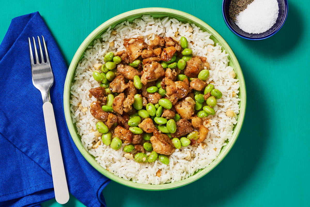 Chicken is always a weeknight winner. It’s satisfying, speedy, and so versatile, which is why our chefs are always brainstorming new ways to wow you. This week, they whipped up a dreamy sauce of plum jam, Dijon mustard, fresh ginger, and garlic that adds sweet, tangy, and aromatic complexity to tender thigh meat. It’s sautéed along with plump edamame and served atop buttery peanut-studded rice—all in a quick 20 minutes. Hate to say it, but you’d be chicken not to try it!