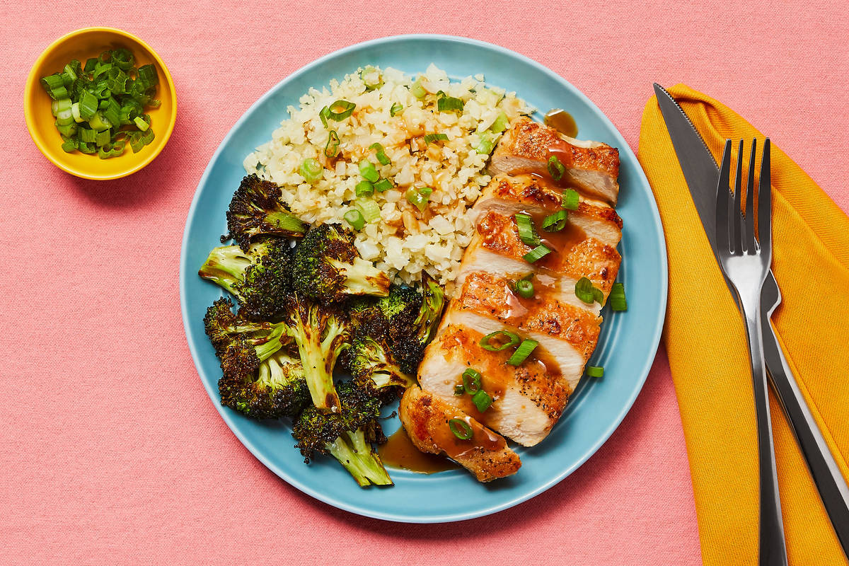 Peter Piper plucked a plate of ponzu plum pork chops. At least, we bet he would have once he got a taste of tonight’s dinner. It stars an indulgent, flavorful sauce made with ponzu, plum jam, and Sriracha—thickened just enough to coat juicy pork chops. You won’t be mad if some of that tangy-sweet sauce drips onto the tender cauliflower rice and sesame roasted broccoli. And what happened to our friend Peter Piper? He polished off that plate of ponzu plum pork chops.