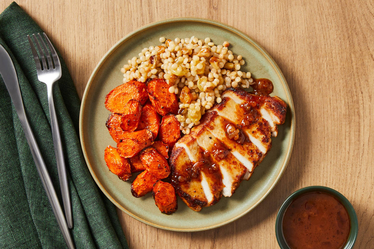 Sweet-tangy-smoky combos are our jam, literally. These pan-seared pork chops are topped with a sauce that combines cranberry jam and a cinnamon-paprika spice blend to stunning effect, offering a delightful contrast of flavors. Walnut-raisin couscous with shallots and smoky roasted carrots are also on hand to support all that deliciousness, coming together for a sophisticated dinner idea with fun textures and flavors for everyone.