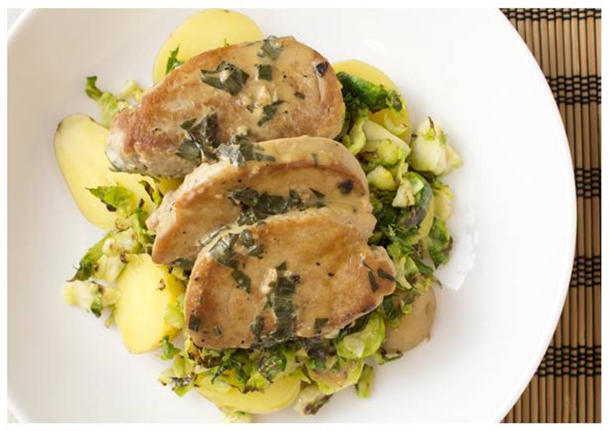 undefinedundefined protein Pork is seared and finished in a tarragon cream sauce. This savory dish is served over potatoes and crispy shaved brussels sprouts!