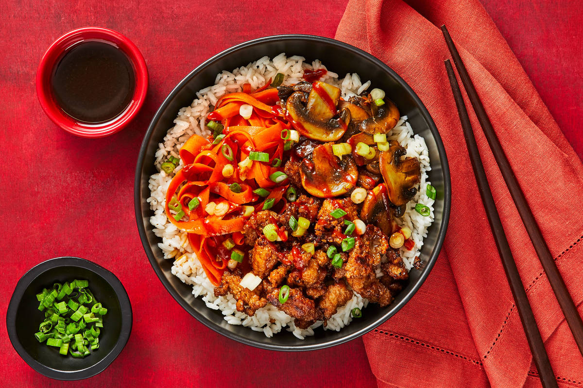 This dish takes its name from the Korean word for mixing rice. Which is exactly what you’re meant to do after serving it: put your rice in a bowl, add the toppings, and mix it all together so that those flavors and textures combine in a glorious mishmash. There are plenty of flavors and textures going on here, too, like sweet carrot, mighty mushrooms, and pork tossed with garlic, ginger, and soy sauce.