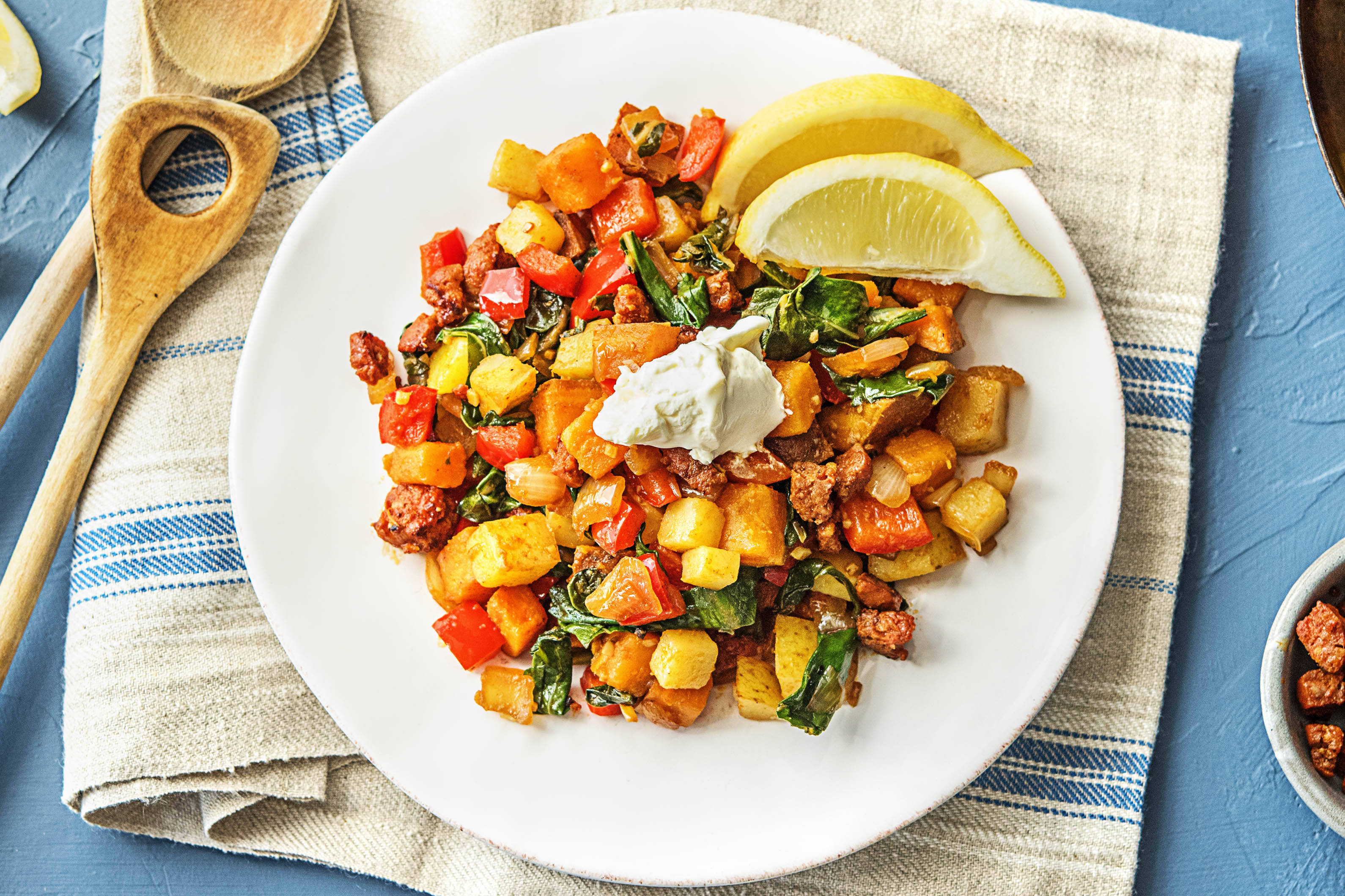 with Chorizo Veggie Crumbles, Poblano, and Sour Cream