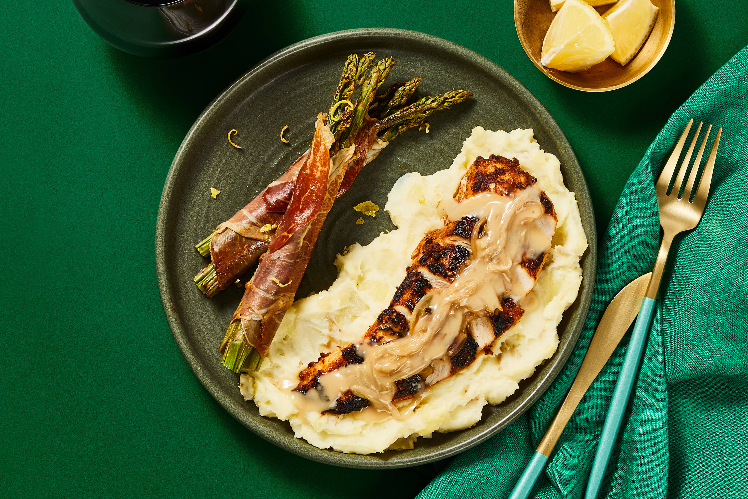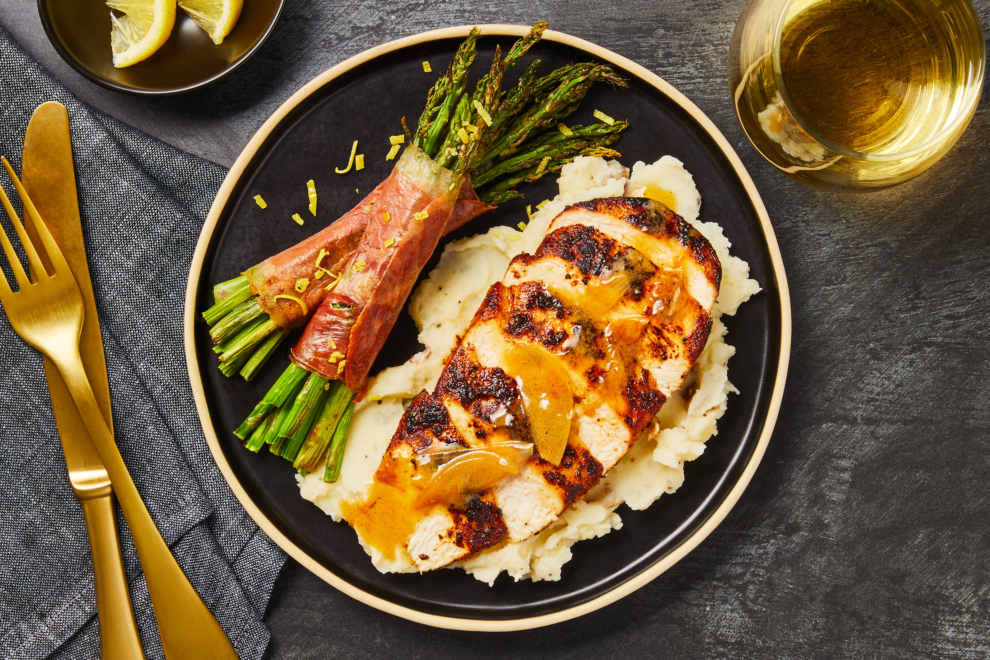 with Prosciutto-Wrapped Asparagus & Mashed Potatoes
