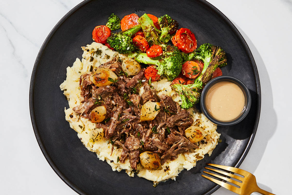 Savor the flavors of a home-cooked meal in this rich and comforting plate. Beef is braised until fall-apart tender and topped with creamy jus and thyme-roasted pearl onions. It’s served over a luxurious base of sour cream and onion-mashed Yukon Golds flecked with minced chives. For the vegetable side, broccoli and carrot coins are roasted with rosemary and dolloped with Parmesan-herb butter.