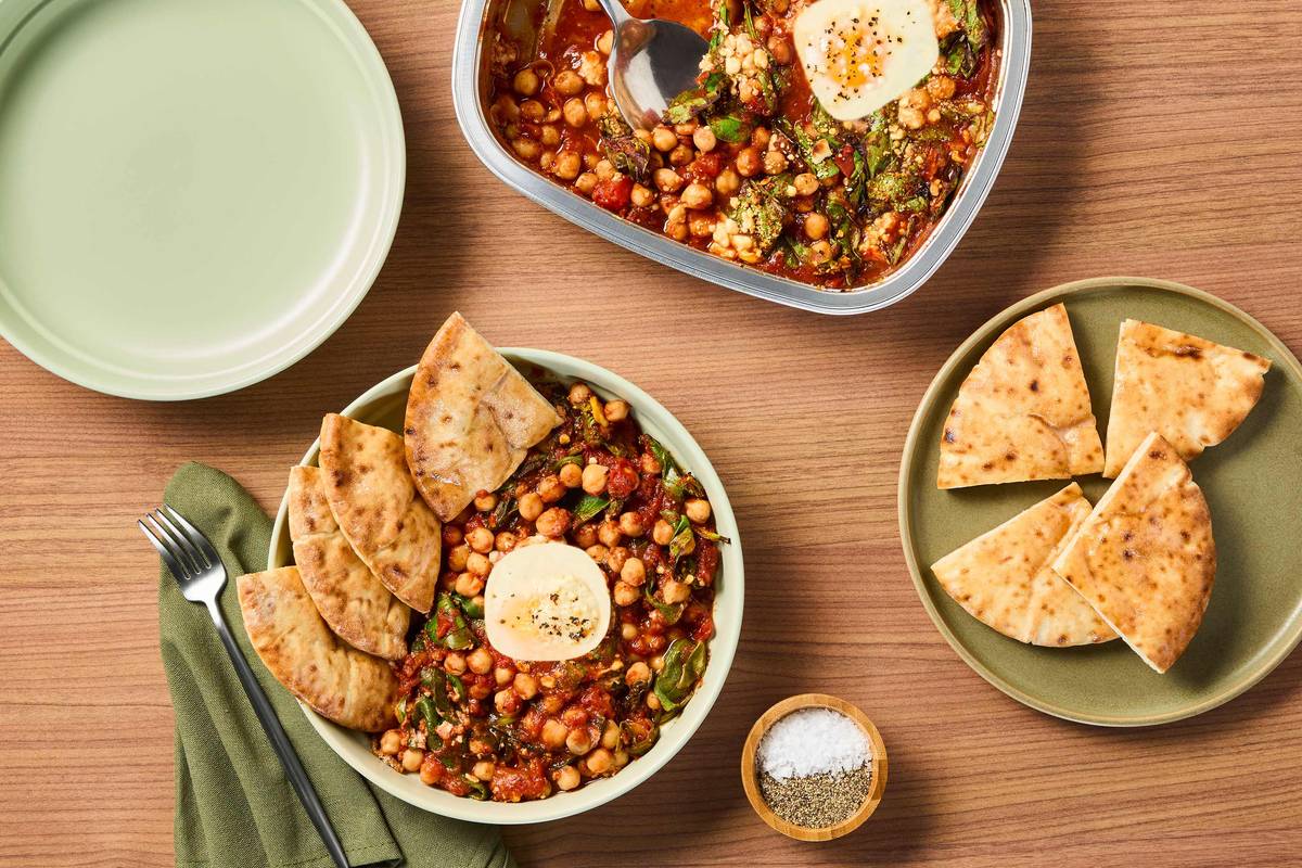 This hearty egg dish is perfect for any time of day! Combine crushed tomatoes, chickpeas, fresh spinach, and seasonings right in our oven-ready tray, then crack two eggs over the top and sprinkle with briny feta cheese. Let it simmer in the oven, then serve with buttery toasted pita for scooping it all up or dipping into a delicious jammy yolk.
