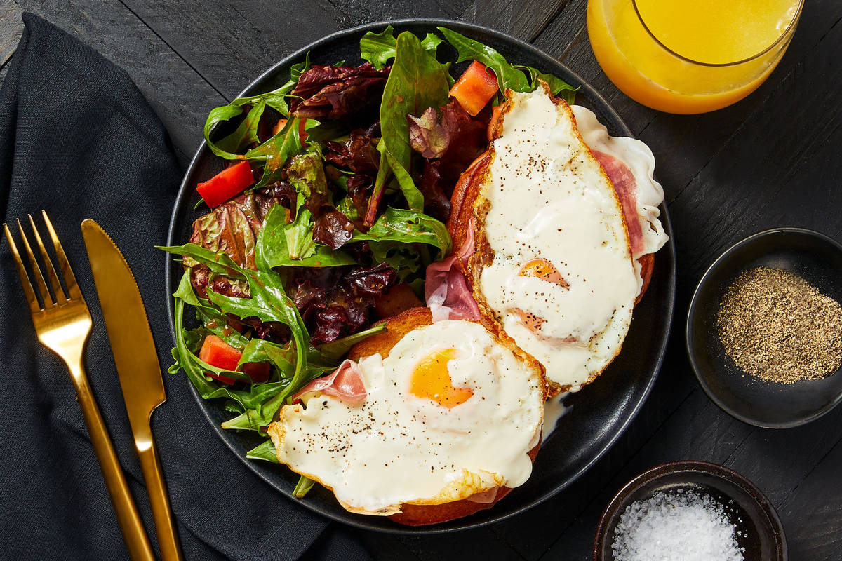 It’s all about decadence when it comes to eggs Benedict, and our quick and easy spin is no exception. We’ve substituted rich, pillowy brioche buns for plain old English muffins, and you don’t have to fear the fussy Hollandaise sauce—we’ve made it 100% foolproof using a super-secret method from the HF Test Kitchen. Next you’ll fry (or poach) eggs just the way you like them, perch them on top of prosciutto (buh-bye, Canadian bacon!), and slather with creamy sauce. A green salad with juicy tomatoes and savory-sweet balsamic vinaigrette rounds out this 20-minute brunch gem.