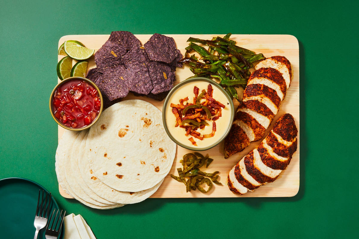 • Wrap tortillas in damp paper towels; microwave until warm and pliable, 30 seconds. • Slice chicken crosswise. • Transfer queso fundido to a bowl if desired, or serve directly from pot. Sprinkle queso fundido with bacon and a few slices of pickled jalapeño. If desired, top with a few spoonfuls of pico de gallo (draining first). • Place queso fundido in the center of a large serving board; arrange chicken, tortillas, chips, roasted peppers, and remaining pickled jalapeño (draining first) alongside. (TIP: If chips don’t fit on your board, serve alongside!) Top chicken with a squeeze of lime juice and serve with remaining lime wedges and remaining pico (draining first) on the side.