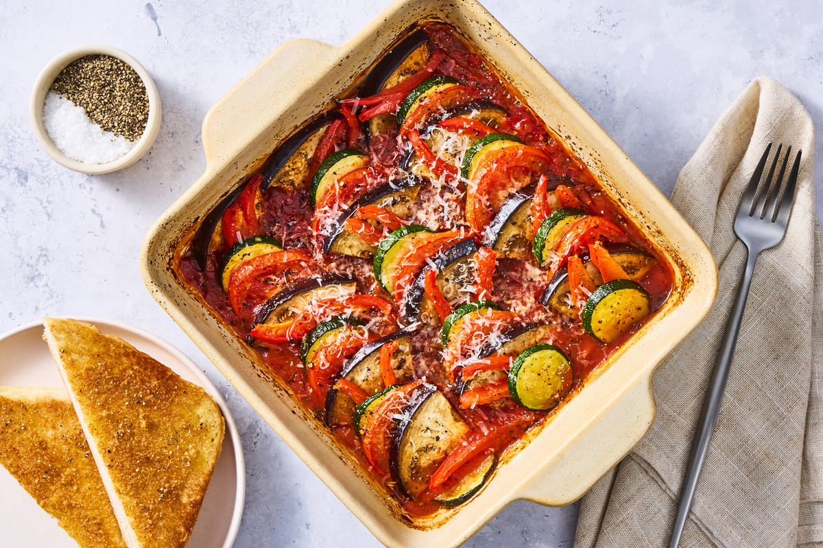 In this stunning version of the French summer stew, you'll arrange thin slices of eggplant, tomato, zucchini, and bell pepper over a chunky homemade tomato sauce. Bake until browned and tender, shower with Parmesan, and serve with crusty ciabatta garlic bread.