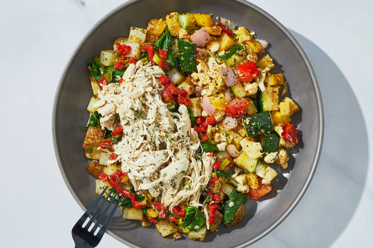 Ingredients: Boneless Chicken Breast With Rib Meat, Russet Potatoes (Russet Potatoes, Sodium Metabisulfite (Added To Maintain Color)), Red Peppers (Red Sweet Pepper, Water, Citric Acid), Zucchini, Spinach, Yellow Squash, Cauliflower, Olive Pomace Oil (Refined Olive Pomace Oil, Extra Virgin Olive Oil), Green Onions, Red Bell Peppers, Red Onions, Water, Garlic, Vinegar, Lemon Juice, Basil, Red Wine Vinegar (Diluted With Water To 5% Acidity), Sea Salt, Toasted Garlic, Granulated Garlic, Dried Parsley, Dried Onion Flakes, Granulated Onion, Lemon Zest, Dried Oregano, Rosemary, Smoked Black Pepper (Pepper, Smoke Flavor), Black Pepper, Ground Fennel, Gochugaru Chile Flakes The nutrition facts are based off of the recommended serving size. Serving Size = 1 Tray (405g)