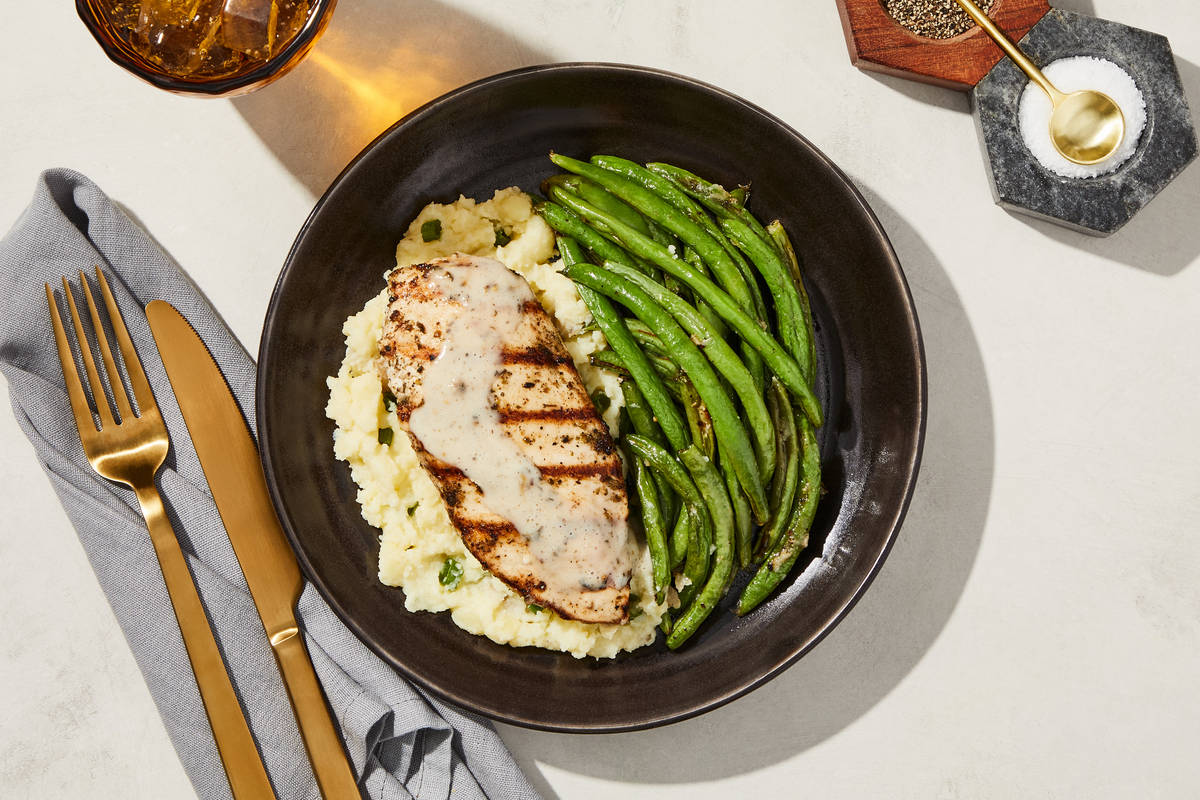 Our grilled chicken is marinated in a bold, complex blend of black pepper, onion, and plenty of roasted garlic. We serve it with a Yukon mash swirled with sour cream and green onion—perfect for soaking up the rich thyme-infused gravy. On the side are garlicky roasted green beans to complete the meal. **Ingredients:** Boneless Chicken Breast With Rib Meat, Green Beans, Yukon Gold Potatoes (Yukon Gold Potatoes, Sodium Metabisulfite (Added To Maintain Color)), Water, Garlic, Sour Cream (Cultured Cream), Olive Pomace Oil (Refined Olive Pomace Oil, Extra Virgin Olive Oil), Whole Milk (Pasteurized Milk, Vitamin D3), Green Onions, Brown Chicken Stock (Chicken Stock, Mirepoix Stock (Made Of Carrot, Celery And Onion Stocks), Salt, Gelatin, White Wine), Vinegar, Unsalted Butter (Pasteurized Cream, Natural Flavorings), Sea Salt, Cream Cheese (Pasteurized Milk And Cream, Salt, Cheese Culture, Stabilizers (Xanthan Gum, Carob Bean Gum, Guar Gum)), Red Wine Vinegar (Diluted With Water To 5% Acidity), Smoked Black Pepper (Pepper, Smoke Flavor), Granulated Onion, Italian Seasoning (Garlic, Oregano, Basil, Black Pepper, Parsley, Rosemary, Marjoram, Thyme, Savory, Sage), Toasted Garlic Powder, Toasted Onion Powder, Toasted Garlic, Black Pepper, Xanthan Gum, Thyme The nutrition facts are based off of the recommended serving size. Serving Size = 1 Tray (329g)