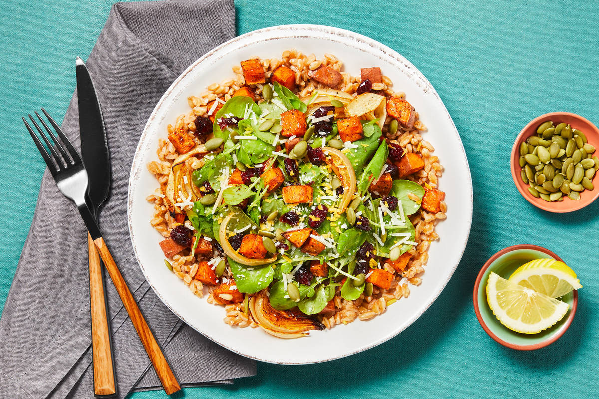 Farro, a variety of hulled wheat, is praised for its chewy texture and nutty flavor. To make this grain bowl shine, we pair our beloved farro with roasted vegetables, fresh watercress, sweet-tart marinated cranberries, lemony dressing, nutty Parmesan, and crunchy pepitas. You’re not farro from digging into this hearty meal.