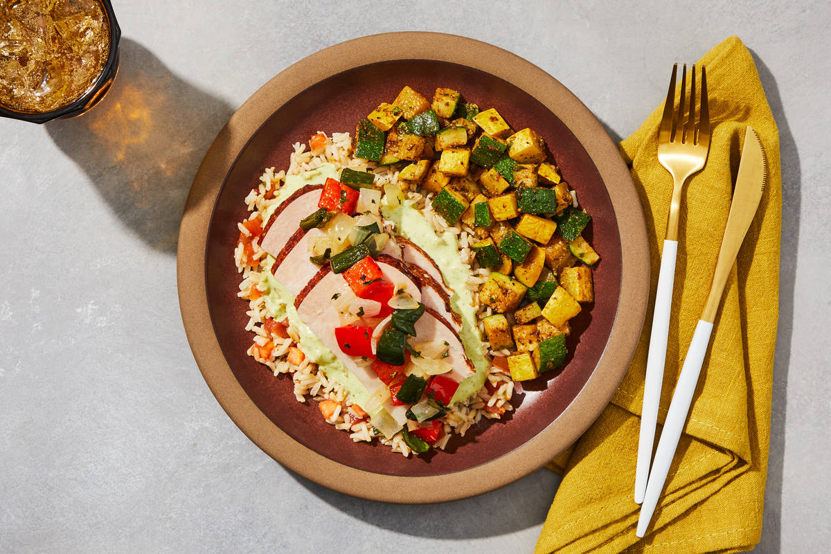 This satisfying bowl starts with fire-roasted tomato and cilantro brown rice seasoned with a hint of lime. It’s draped in a rich, creamy poblano cheese sauce topped with tender slices of turkey breast and garnished with roasted poblanos and onions. Southwest-seasoned roasted zucchini and yellow squash completes the meal. **Ingredients:** Turkey Breast (Turkey Breast, Turkey Stock, Contains 2% Or Less Vinegar, Salt, Dried Onion, Spices), Zucchini, Water, Yellow Squash, Brown Basmati Rice, Shredded White Cheddar Cheese (Pasteurized Milk, Cheese Cultures, Salt, Enzymes, Anti-Caking Agents (Potato Starch, Powdered Cellulose, Natamycin (A Natural Mold Inhibitor))), Poblano Peppers, Whole Milk (Pasteurized Milk, Vitamin D3), Cream Cheese (Pasteurized Milk And Cream, Salt, Cheese Culture, Stabilizers (Xanthan Gum, Carob Bean Gum, Guar Gum)), Onions, Red Bell Peppers, Tomatoes, Heavy Cream (Heavy Cream, Milk, Gellan Gum, Sunflower Lecithin), Olive Pomace Oil (Refined Olive Pomace Oil, Extra Virgin Olive Oil), Cilantro, Vinegar, Garlic, Sea Salt, Granulated Garlic, Black Pepper, Cumin, Chili Powder (Chili Pepper, Spices (Including Mustard), Salt, Garlic Powder), Coriander, Lime Juice (Water, Lime Juice From Concentrate), Granulated Onion, Dried Oregano The nutrition facts are based off of the recommended serving size. Serving Size = 1 Tray (352g)