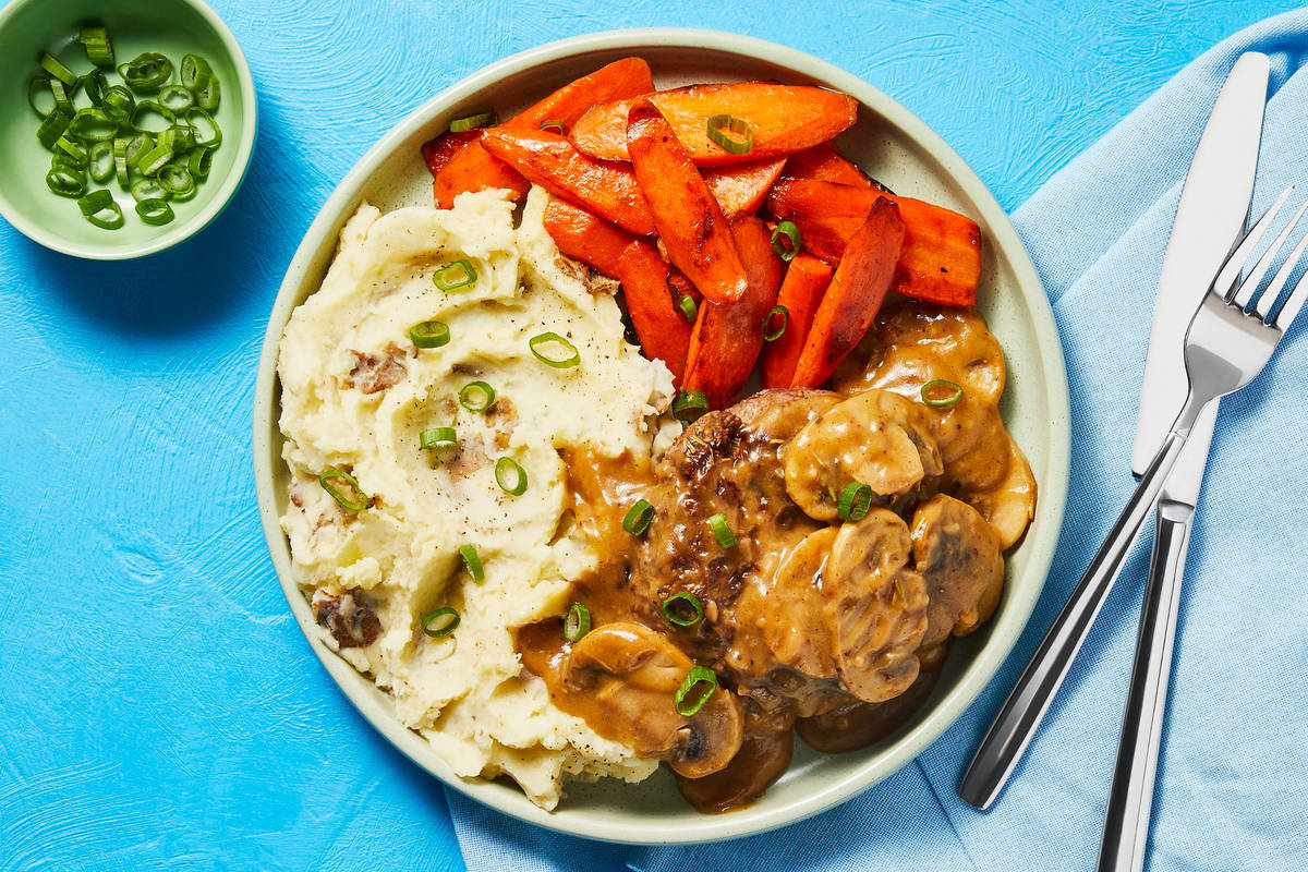 Wow! Amazing meal! The mushroom gravy was absolutely delicious on the Salisbury steaks. The garlic was great in the potatoes. It added flavor without overpowering it. Very delicious meal.