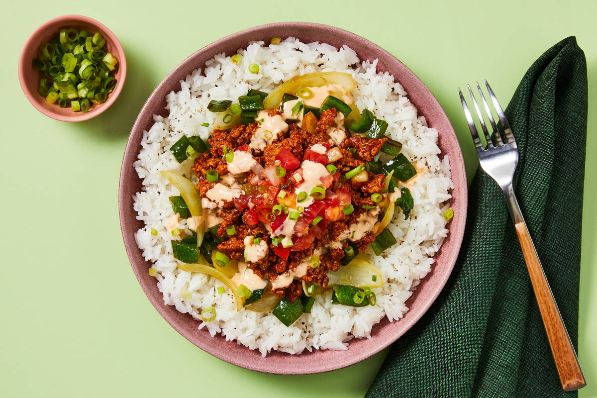 • Fluff rice with a fork. Season with salt and pepper. TIP: Stir in 1 TBSP butter (2 TBSP for 4 servings) for extra richness. • Divide rice between bowls and top with veggies, pork, pico de gallo, crema, and any remaining sauce from pan. Garnish with scallion greens and serve.