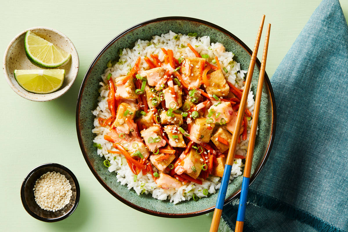 When you have a hankering for sesame chicken, you know how it is—you’ve gotta have it immediately, and nothing else will do. Fortunately, this dish is super speedy to whip up in your very own kitchen. In just 20 minutes (yes, you read that right), you can dig into steamy rice topped with tender chicken and carrots in a stellar sauce that’s tangy, nutty, and just a little bit sweet. For a finishing touch, it’s drizzled with sriracha lime mayo, then sprinkled with scallions and sesame seeds to really take it over the top. Time to conquer that craving, folks.