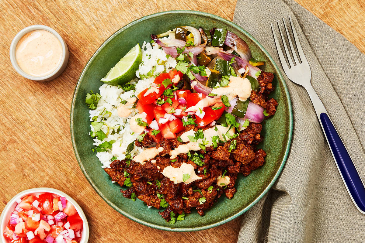 Bowls are way past “having a moment.” They’ve become a pillar of our lunches and dinners. Why? It’s simple: everything’s better in a bowl! (Nice knowing you, plates.) But seriously, the customizable combo of carbs, protein, veggies, and a drizzle of delicious sauce cannot be denied. True to form, this Tex-Mex rendition is fully loaded. Steamy cilantro-lime rice is topped with saucy spiced steak, charred poblano and onion, salsa fresca, and smoky red pepper crema. Who needs the tortilla when you’ve got all that?
