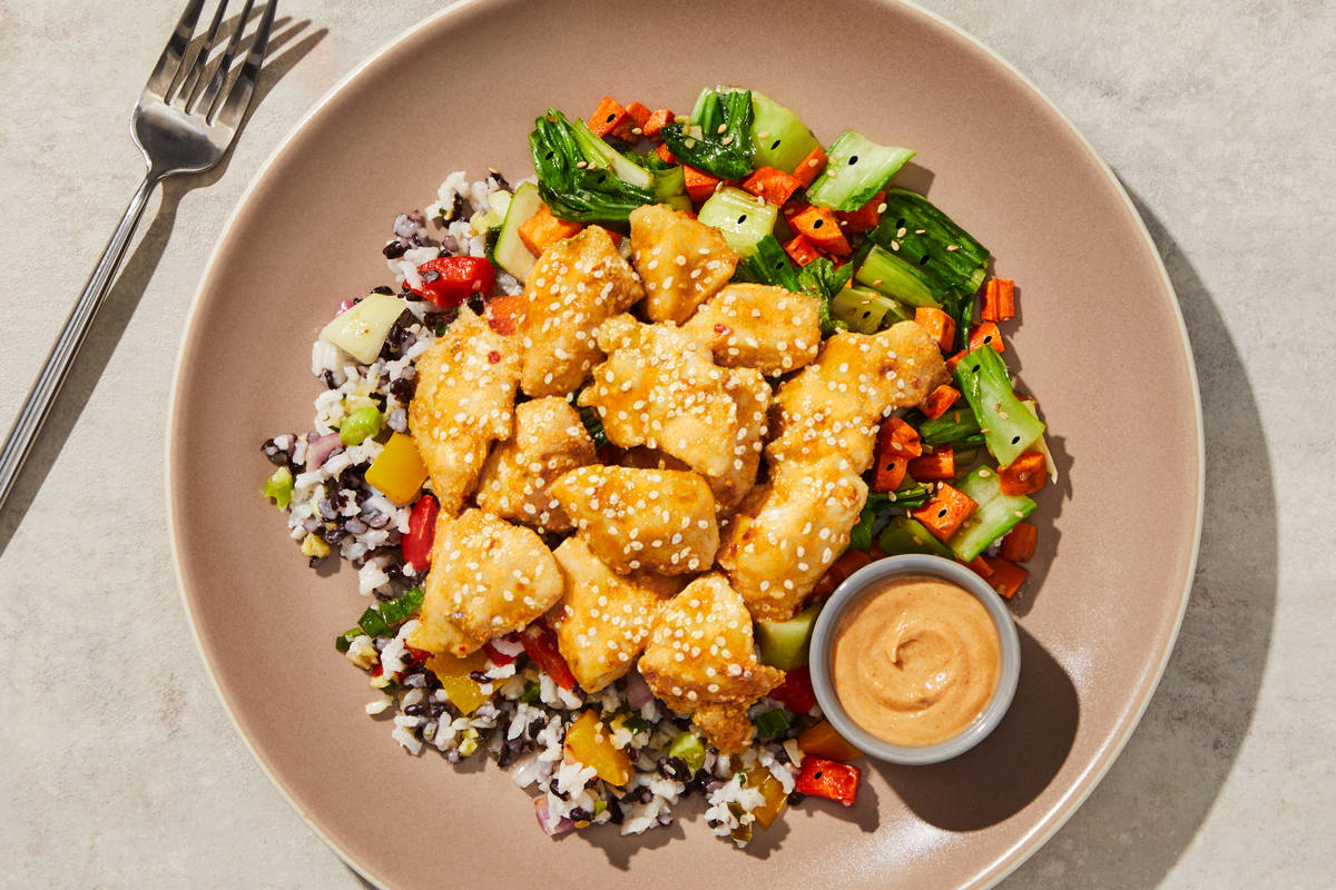 **Ingredients:** Boneless Chicken Breast With Rib Meat, Bok Choy, Water, Carrots, White Jasmine Rice, Yellow Bell Peppers, Red Bell Peppers, Onions, Peanut Butter, Black Rice, Unsalted Butter (Pasteurized Cream, Natural Flavorings), Garlic, Red Onions, Ginger, Blue Agave Nectar, Lime Juice (Water, Lime Juice From Concentrate), Coconut Aminos (Coconut Nectar, Coconut Blossom Sap, Sea Salt), Olive Pomace Oil (Refined Olive Pomace Oil, Extra Virgin Olive Oil), Toasted Sesame Oil, Green Onions, Vinegar, Tamari (Water, Soybeans, Salt, Alcohol (To Preserve Freshness), Lactic Acid, Rice Vinegar), Sea Salt, Ground Ginger, Sambal Oelek Chili Paste (Red Chili Peppers, Salt, Distilled Vinegar, Xanthan Gum), Honey, Roasted Sesame Seeds, Cilantro, Sesame Seeds, Black Sesame Seeds, Rice Vinegar, Granulated Garlic, Tapioca Starch, Cumin, Granulated Onion, Toasted Garlic Powder, White Pepper The nutrition facts are based off of the recommended serving size. Serving Size = 1 Tray (357g)